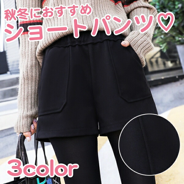 ショートパンツ 秋 冬 ホットパンツ レディース かわいい ハイウエスト ワイドレッグ 黒 無地 ボトムス パンツ ウエストゴム 楽ちん ゆったり レギンス Aライン ブラック ブラウン ベ ポケット