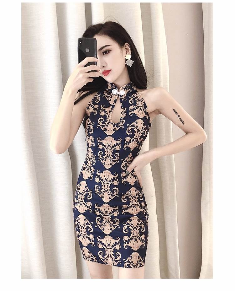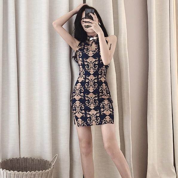 キャバ ドレス チャイナドレス レディース ミニ 超ミニ セクシー ノースリーブ オリエンタル 柄 ネイビー 金色 個性的 かっこいい クール 大人 スタンドカラー おしゃれ キャバ嬢 細身 ワンピ