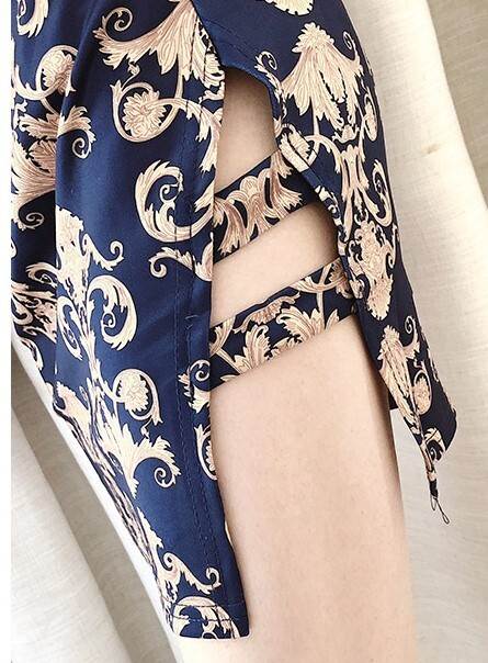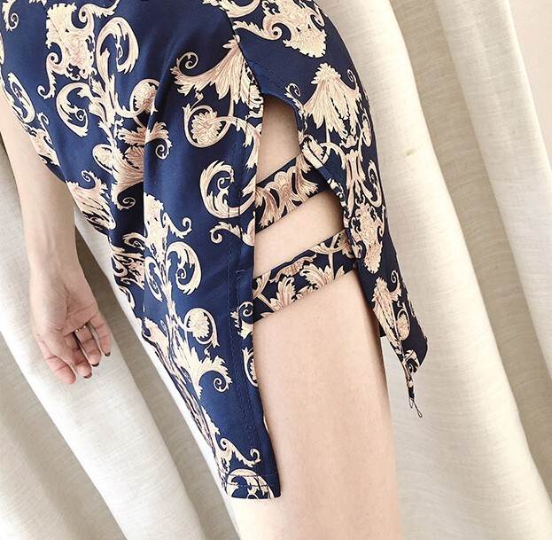 落ち着いたネイビーカラーがベースのチャイナ風ミニドレス