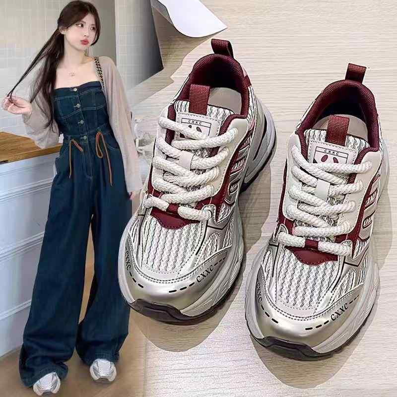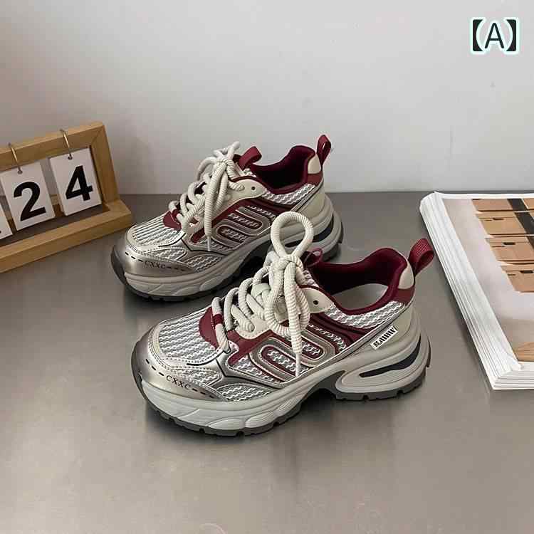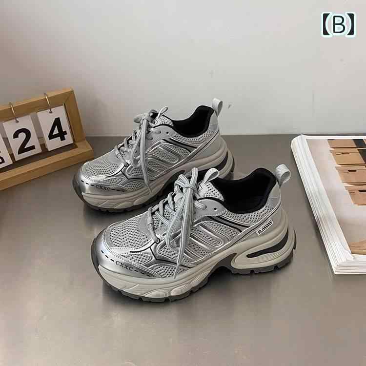 ダッドスニーカー メタリック シルバー 韓国系 スニーカー レディース 可愛い 個性的 光沢 銀色 ボルドー 厚底 ハイテクスニーカー きれいめ かっこいい 運動靴 通気性 軽い ユニーク メッシュ