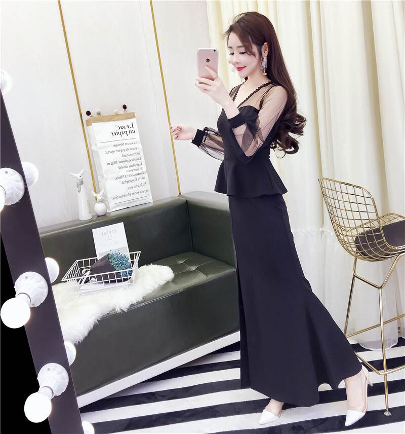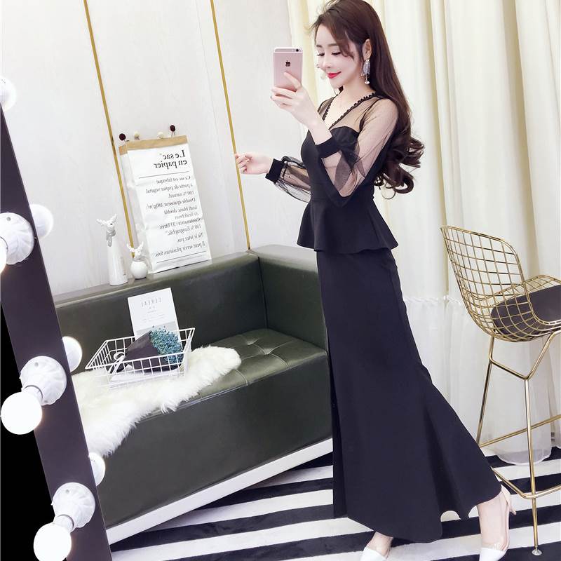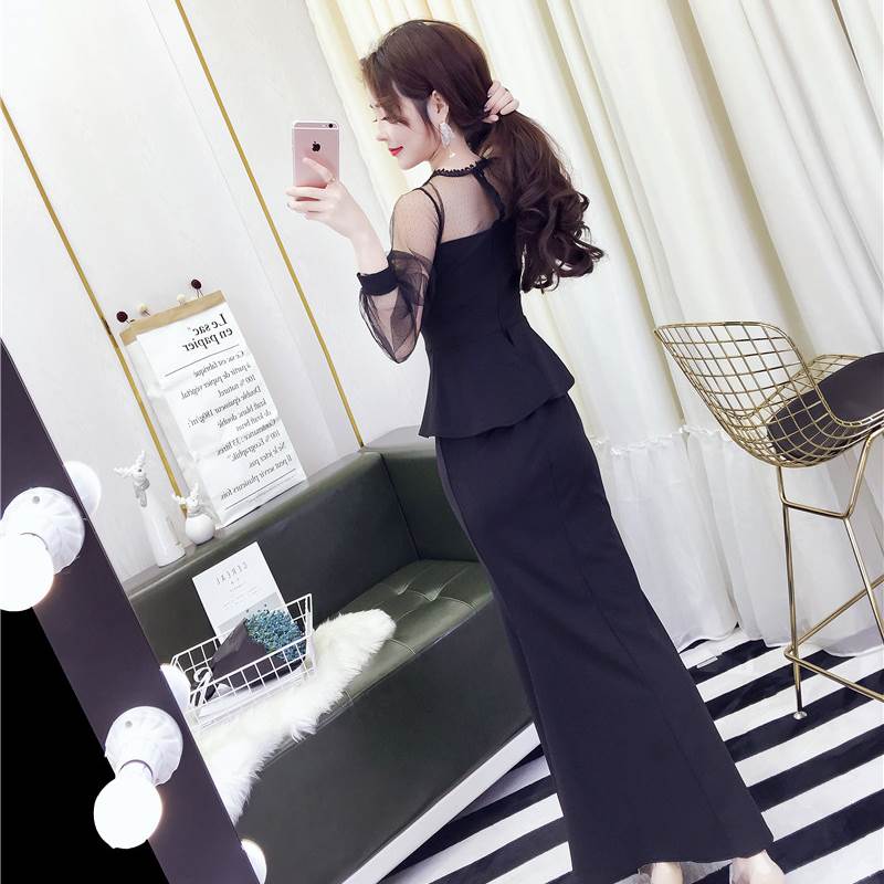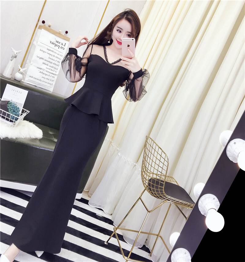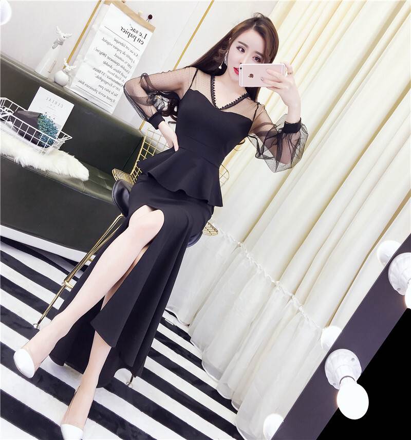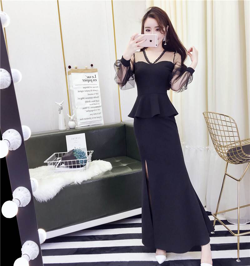キャバ ドレス ロング 黒 セクシー ペプラム マーメイド 大胆 スリット 長袖 無地 パーティードレス タイト ワンピ おしゃれ サイド チラ見せ 個性的 シースルー 透け感 きれ キャバ嬢