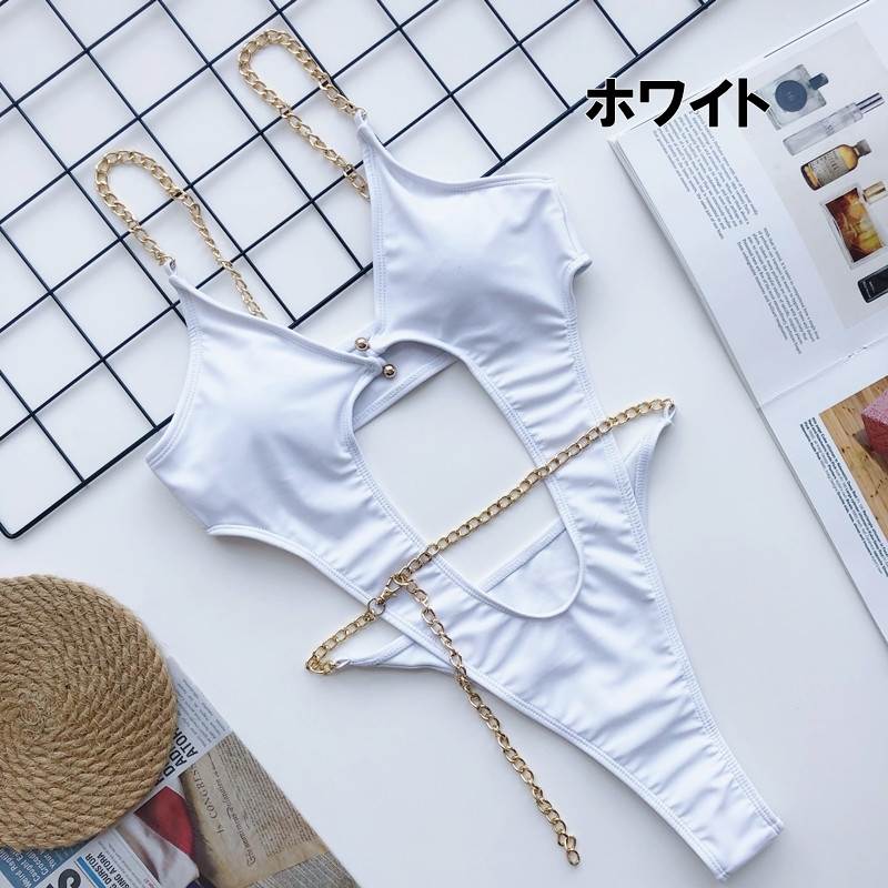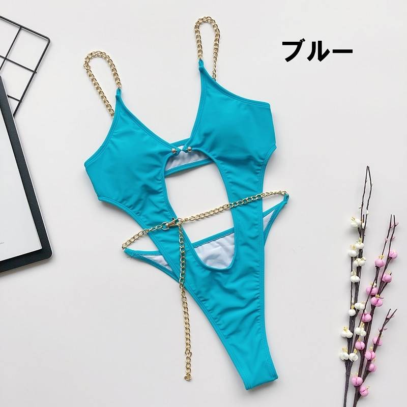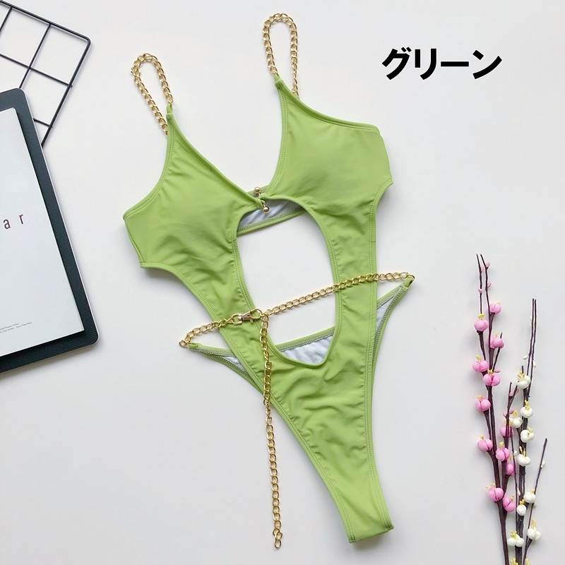 ワンピース 水着 モノキニ ハイレグ セクシー Tバック かっこいい 海外 レディース ブラジリアン風 チェーン カットアウト 黒 白 無地 ピンク 赤 黄色 緑 青 S L 盛れる 谷間見 M