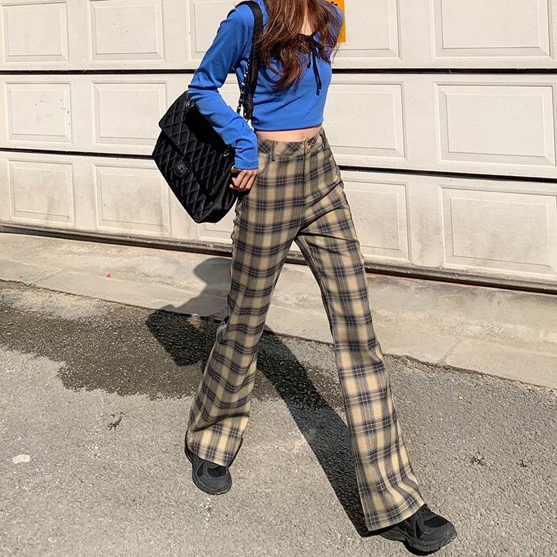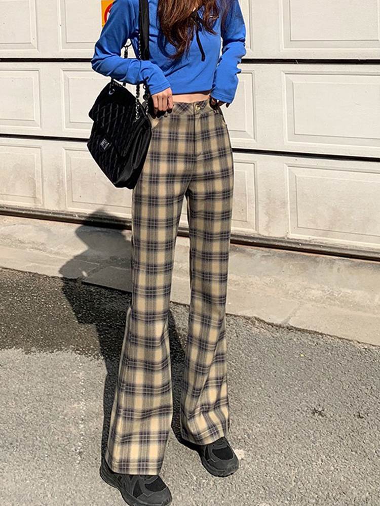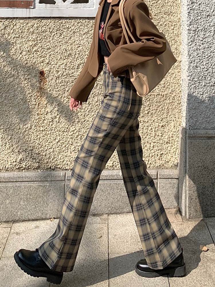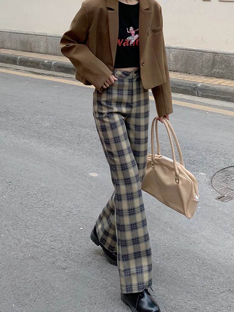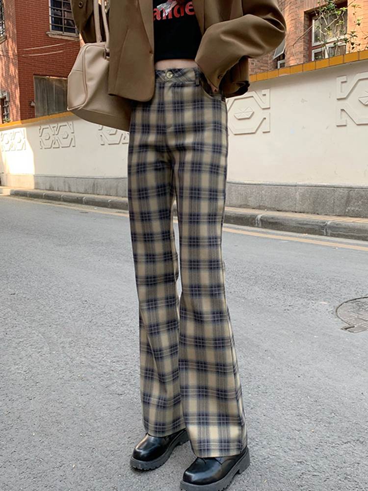 パンツ レディース フレアパンツ ブーツカット チェック 茶色 ブラウン 裾フレア 大人可愛い かっこいい おしゃれ レトロ ガーリー ボトムス ズボン ニュアンスカラー ベイクドカラー ハイウエスト