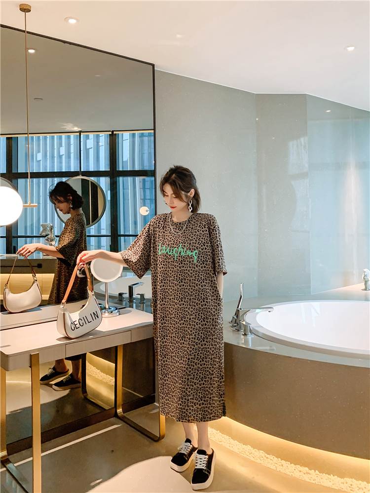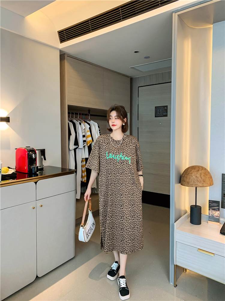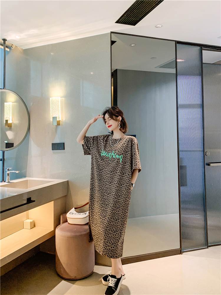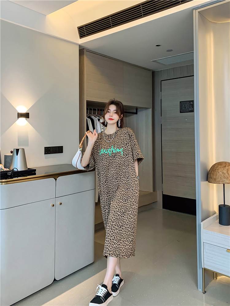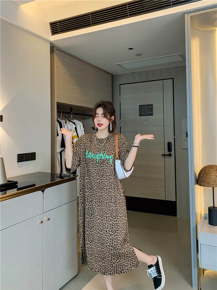 ヒョウ柄 ロング ワンピース レディース 半袖 カジュアル ワンピ レオパード 個性的 ミモレ丈 プリント プルオーバー ラウンドネック ルーズ 大きいサイズ L XL 2XL 春 夏 豹柄 3XL