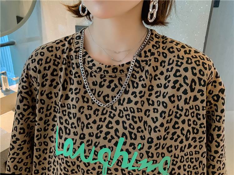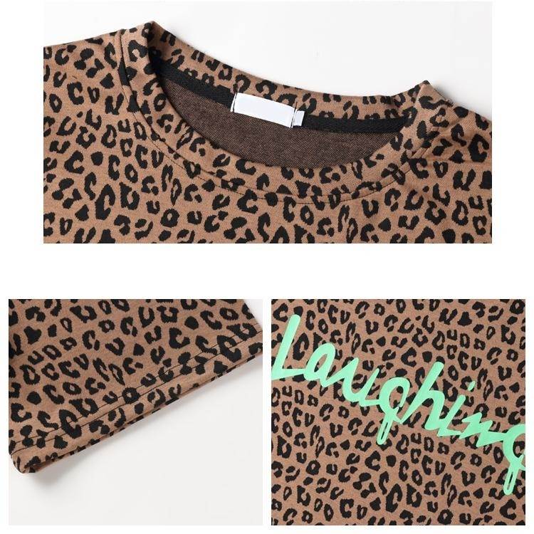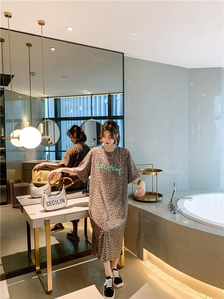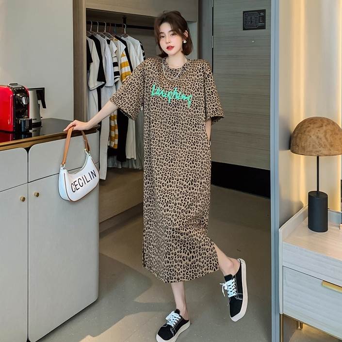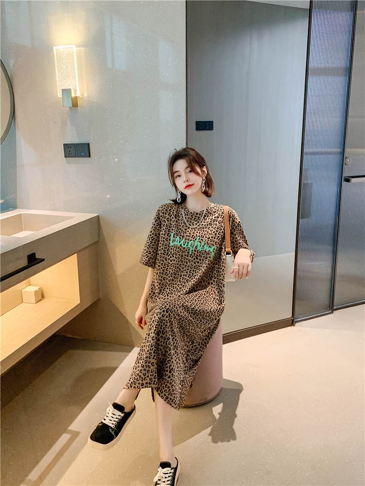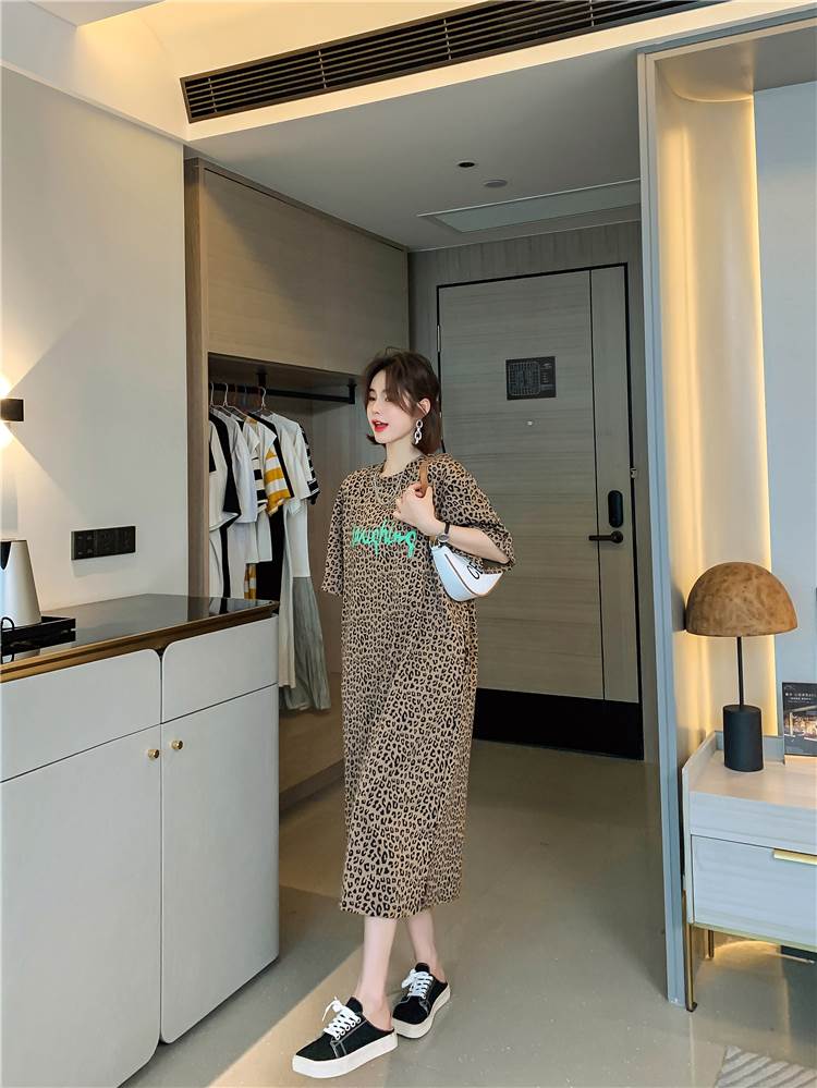 ヒョウ柄 ロング ワンピース レディース 半袖 カジュアル ワンピ レオパード 個性的 ミモレ丈 プリント プルオーバー ラウンドネック ルーズ 大きいサイズ L XL 2XL 春 夏 豹柄 3XL