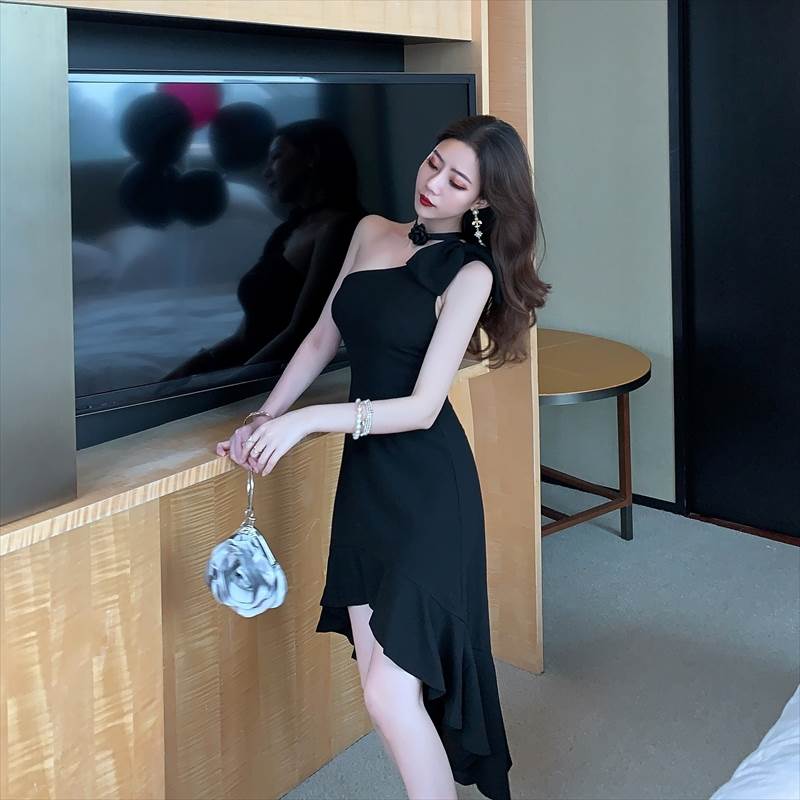 パーティードレス 黒 フィッシュテール レディース ワンショルダー Aライン ハイウエスト キャバドレス 膝上 ミニ リボン 大人可愛い きれいめ 肩見せ お洒落 こなれ感 高見え フォーマ 大人女子