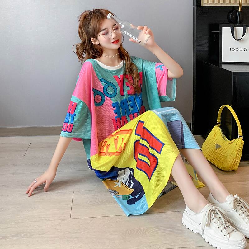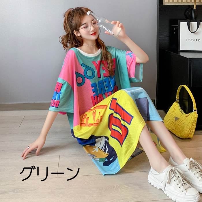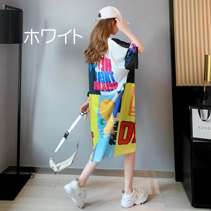 2色 ワンピース レディース Tシャツワンピ ロング ラウンドネック 半袖 アメリカン コミック風 ミドル丈 おしゃれ 派手 柄 ワンピ 個性的 大きいサイズ 白 ホワイト グリーン カジュアル 緑