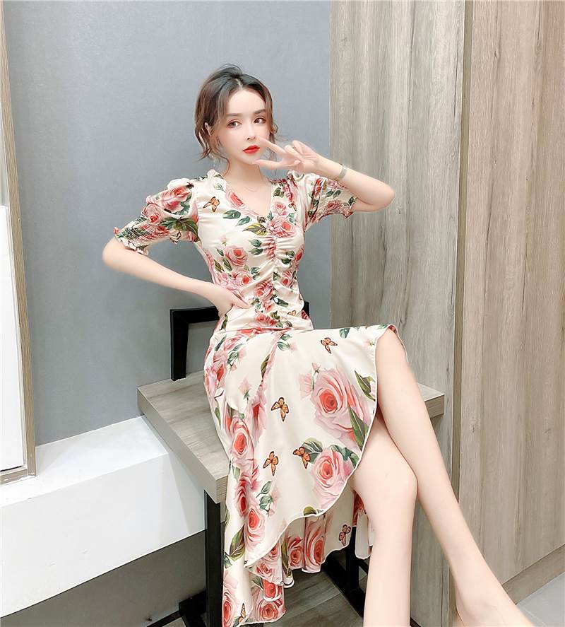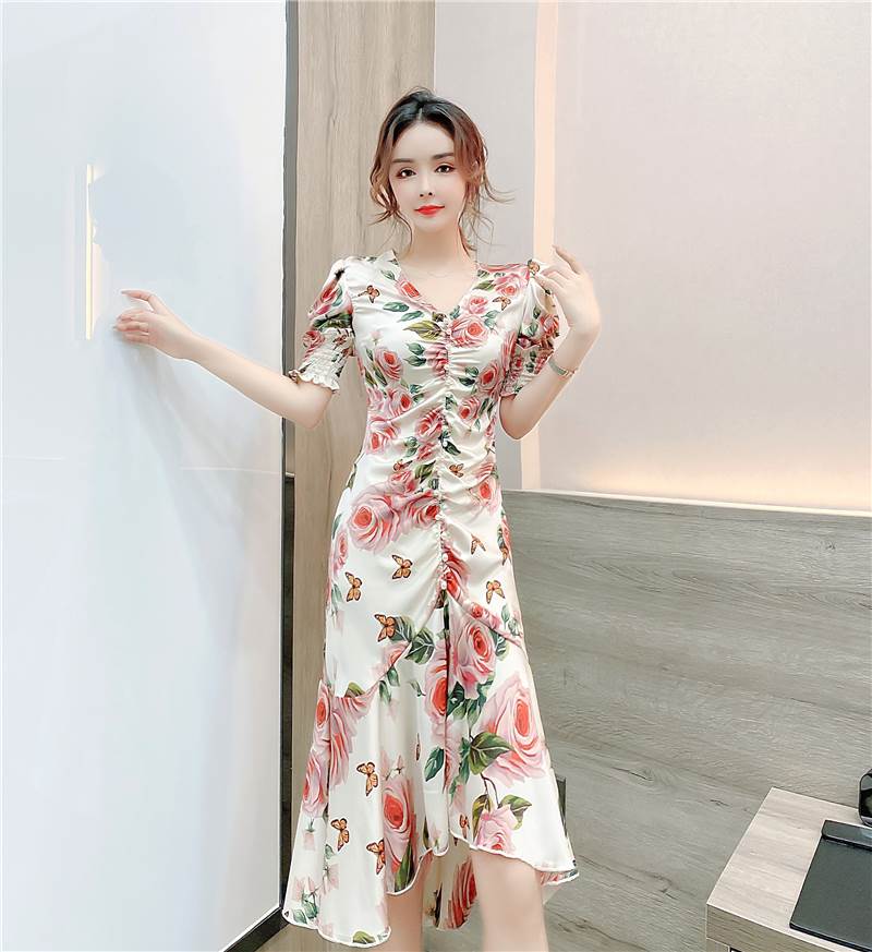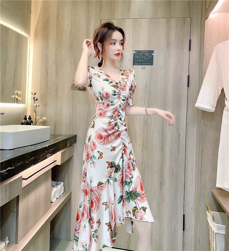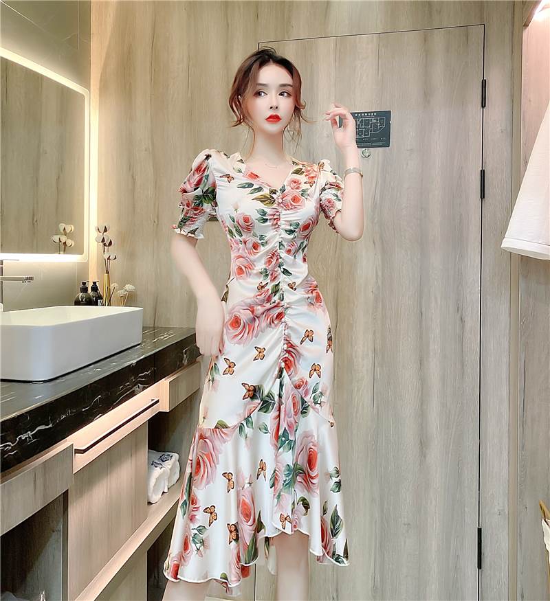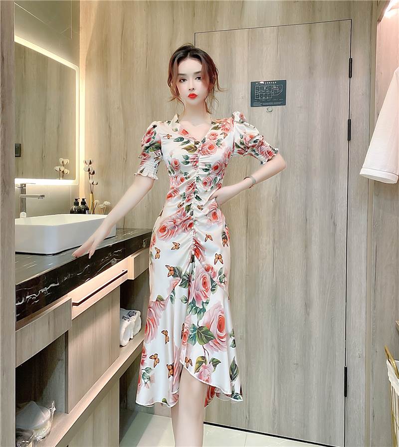 キャバ ドレス 膝丈 半袖 花柄 胸元開き き