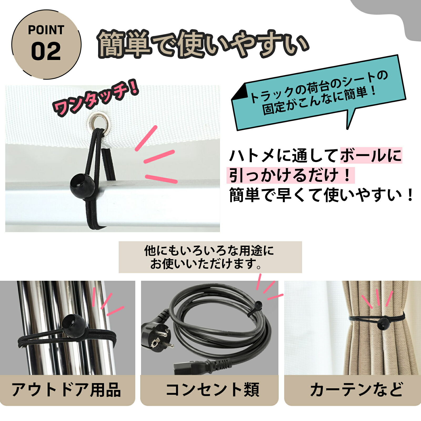 幅広い用途でご利用いただけます。トラックシートの固定、荷物の仮留め、固定用にはもちろん、キャンプで使うテントのタープクッションコードとして、天幕、テントなどのアウトドア用品、照明ライプ、カーテン、サッカーネット、バラソル、コンセントやコード類など。アイデア次第で様々なシーンに対応♪