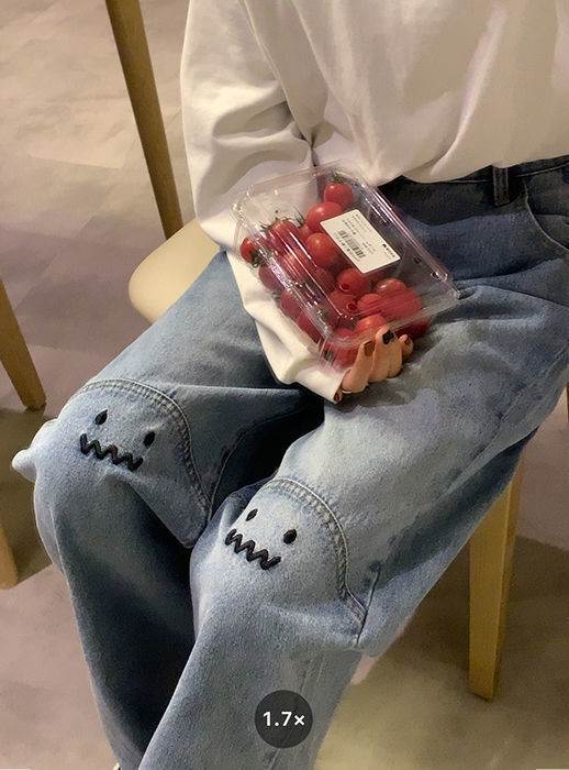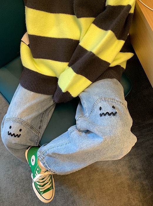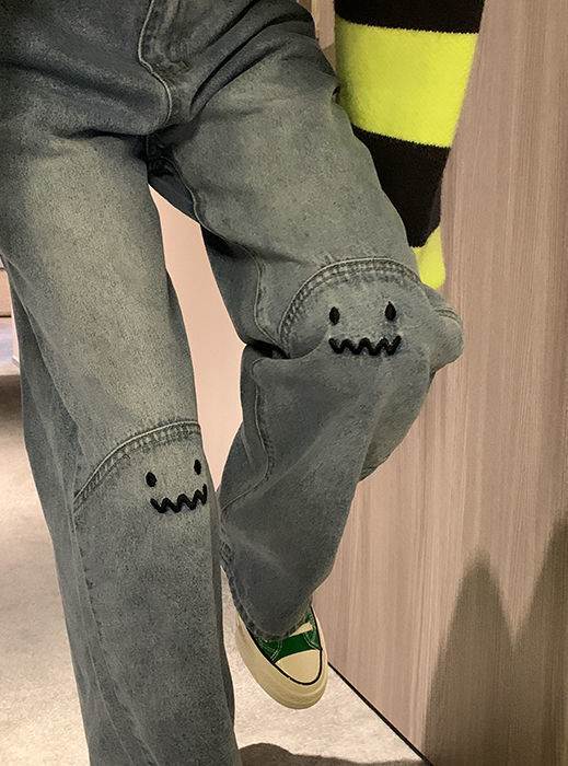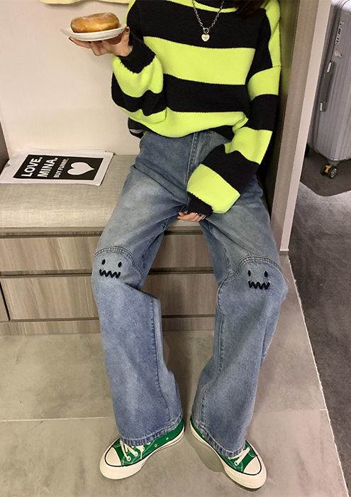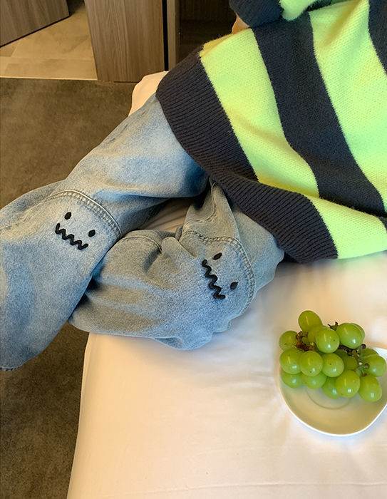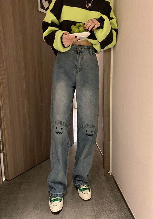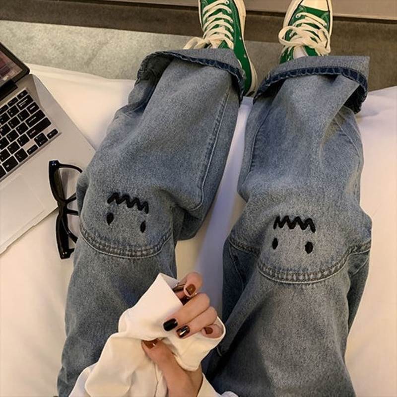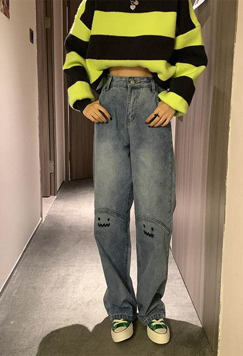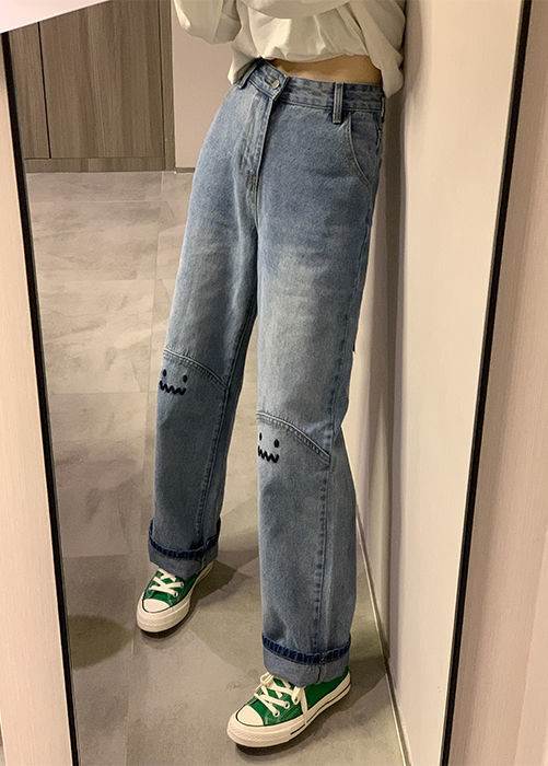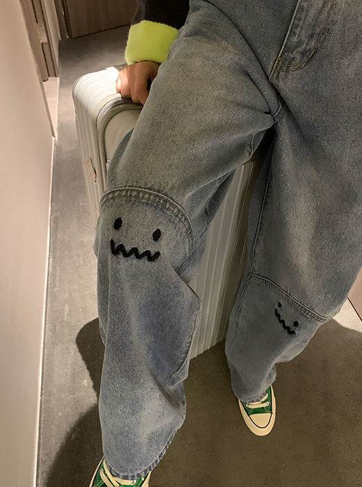 ジーパン ジーンズ デニム カッコイイ キュート ワイドパンツ スマイル ニコちゃん キャラクター パンツ ロング ロング丈 カジュアル ボトム シンプル 春 夏 秋 冬 ブルー 青 大き レディース