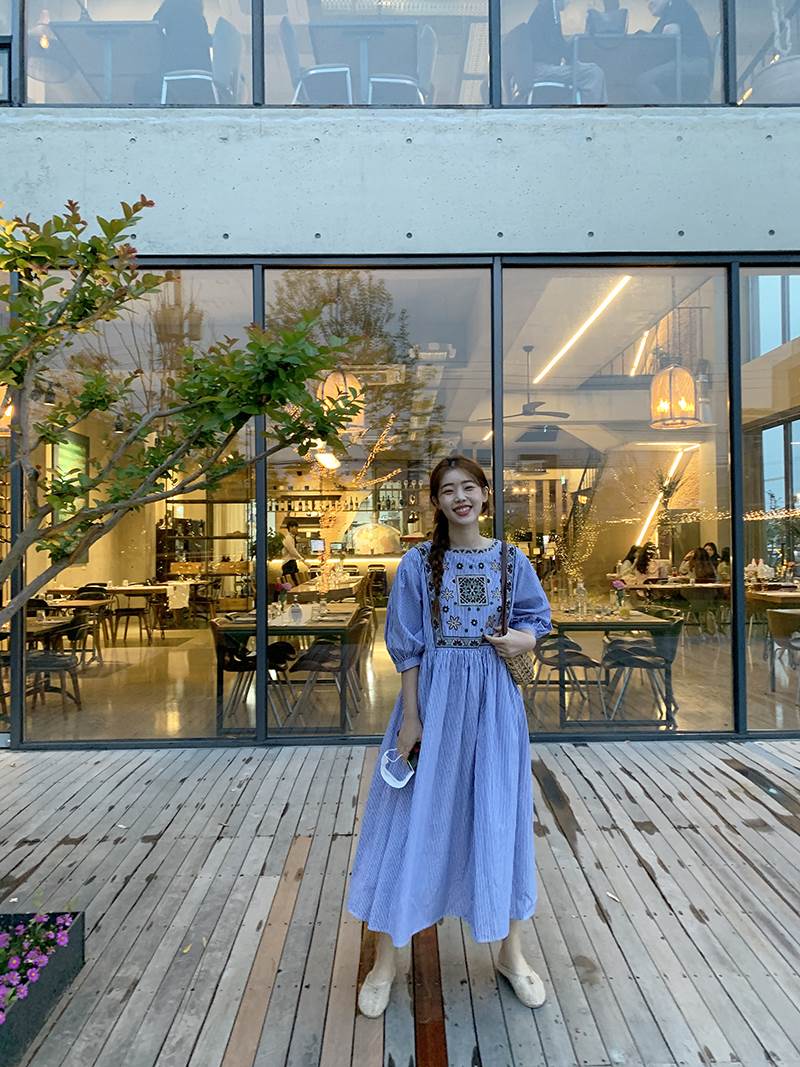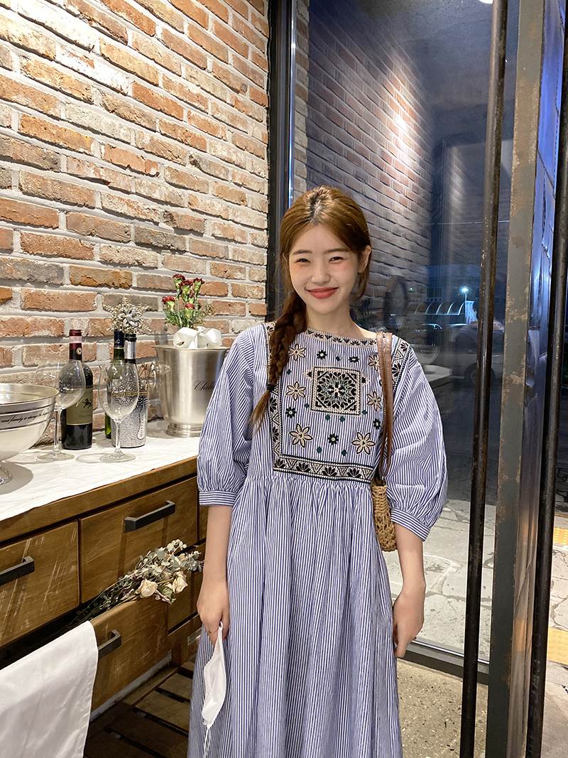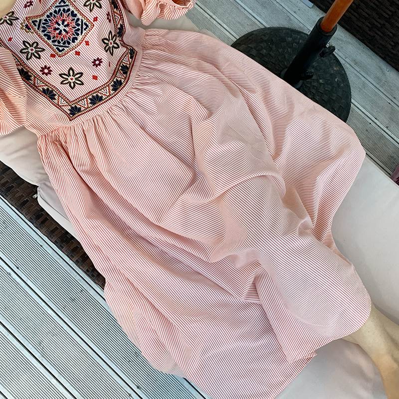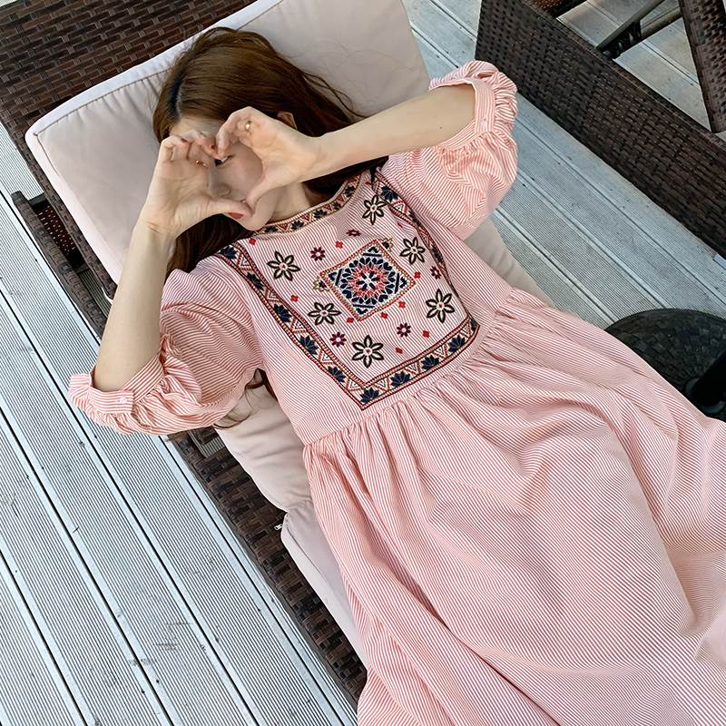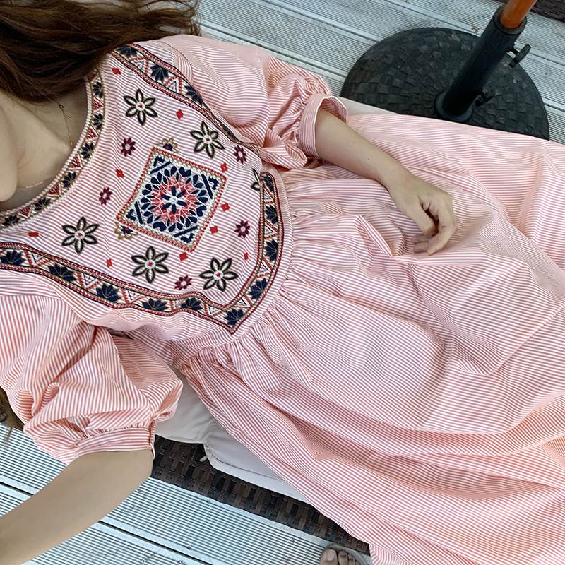 繊細なストライプとボヘミアン刺繍がレトロで可愛いシャツワンピースです。