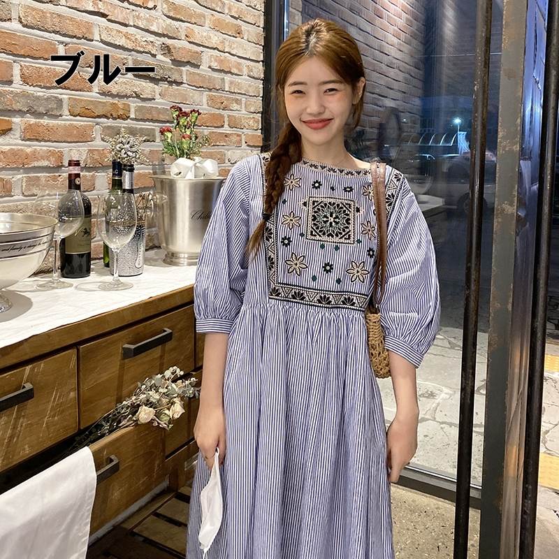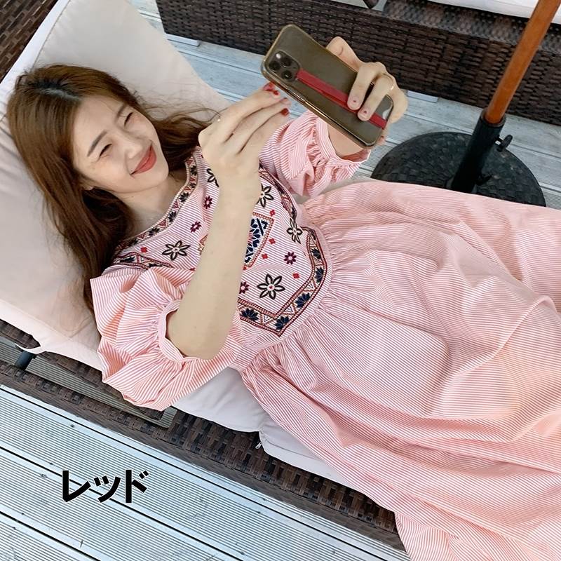 2色 ロングワンピース 刺繍 カジュアル ストライプ シャツワンピ レディース レッド ブルー ボヘミアン ダマスク柄 ミモレ丈 個性的 民族風 大きいサイズ XL 3XL ミドル丈 バルーン 2XL