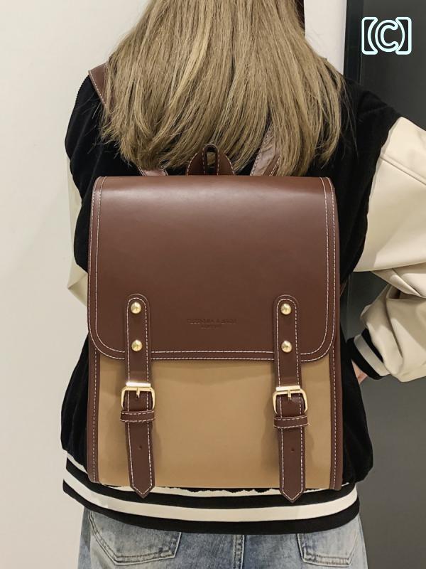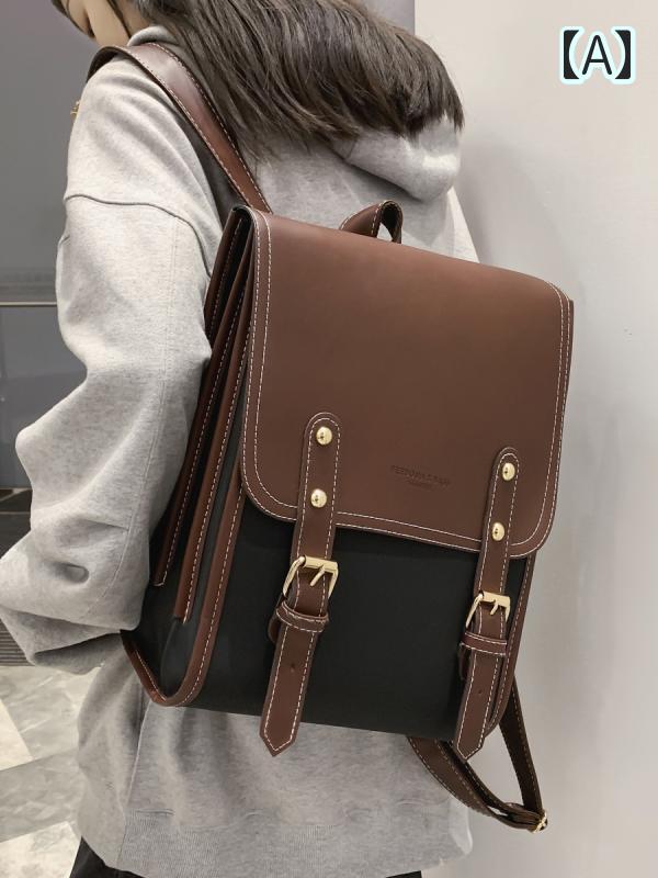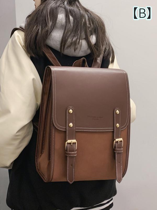 リュックサック レトロ 可愛い プレッピースタイル バックパック 大容量 スクエア型 ランドセル風 韓国系 高校生 大学生 通学 学校 スクールバック かぶせ バイカラー ブラック 茶色 ブラウン 黒