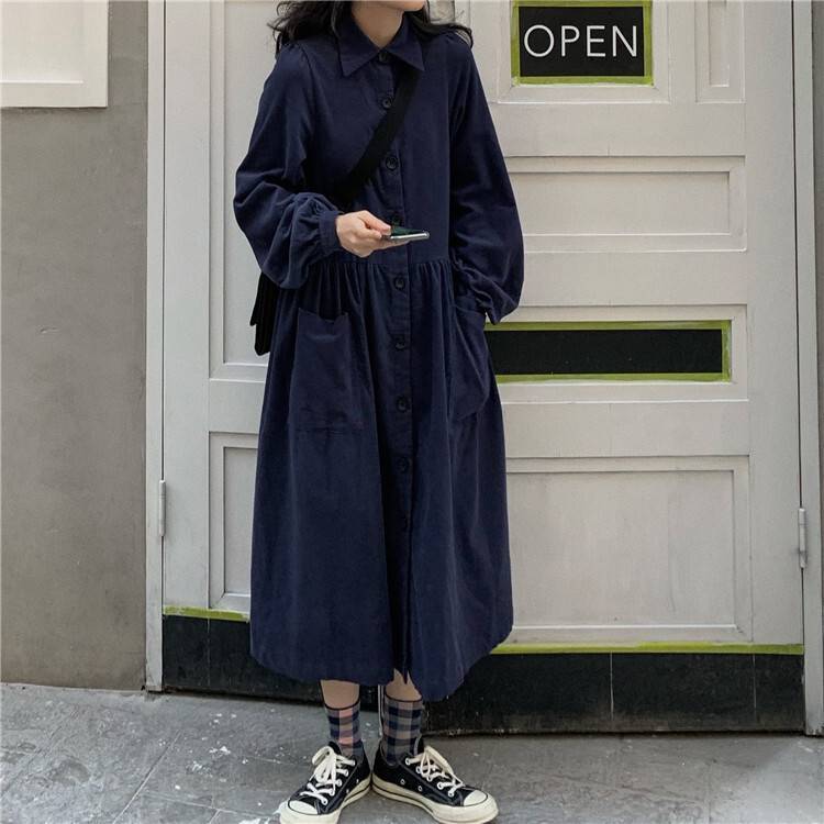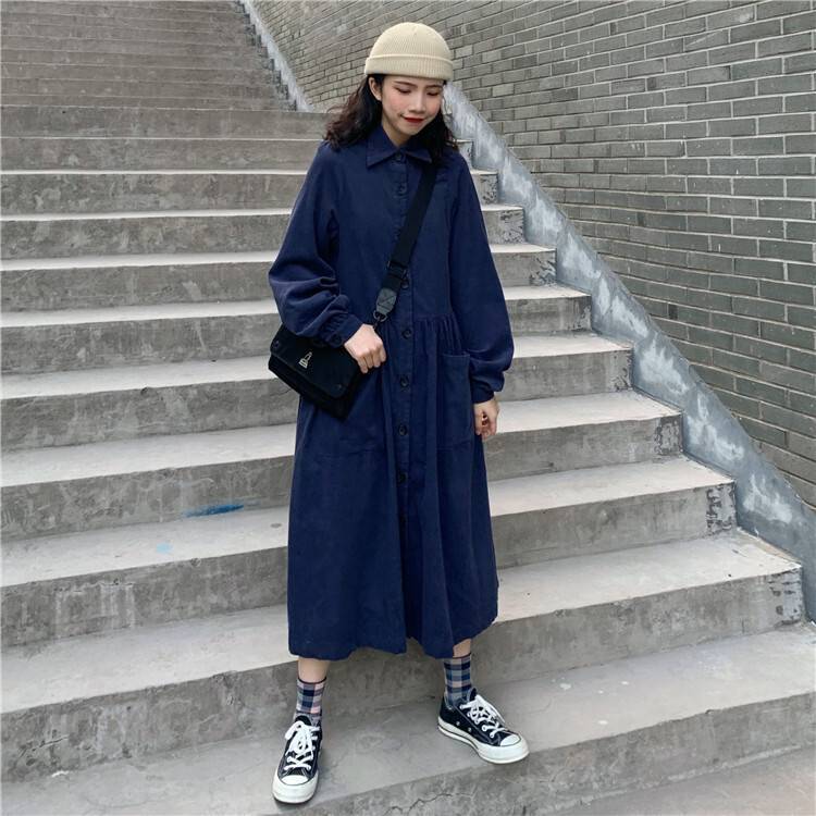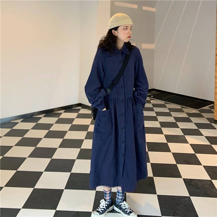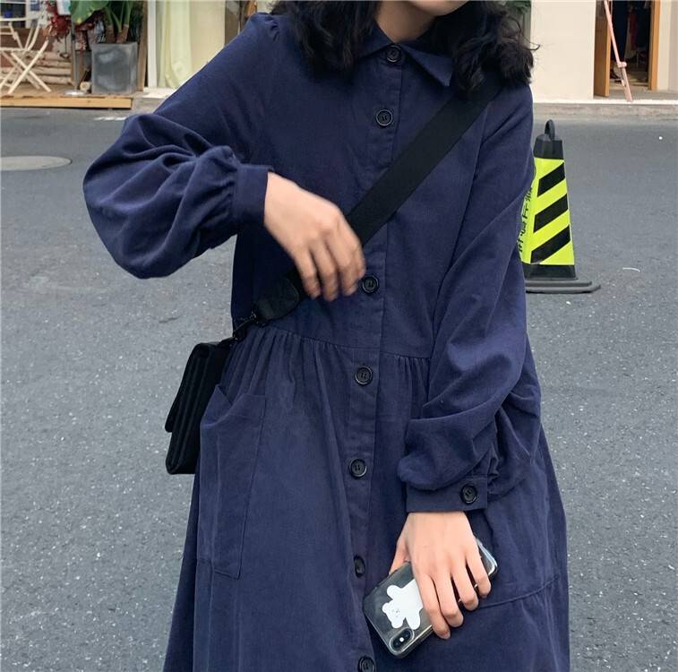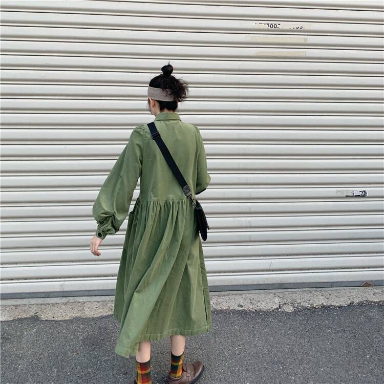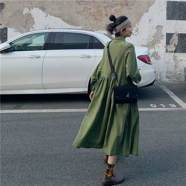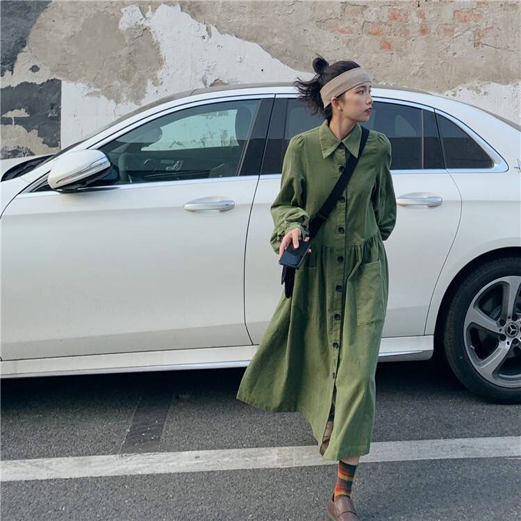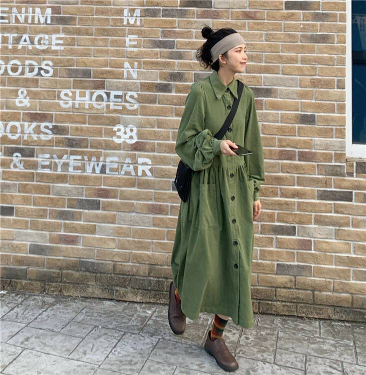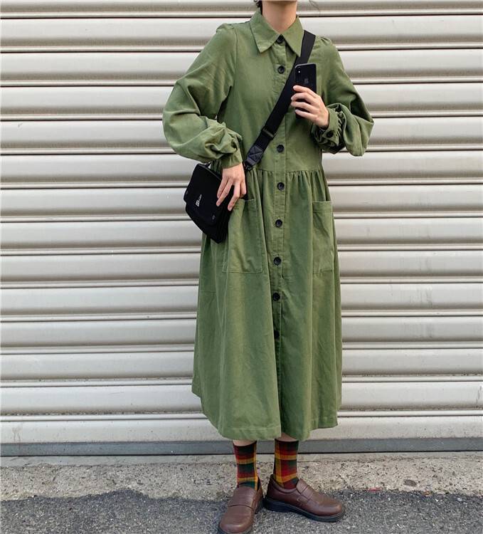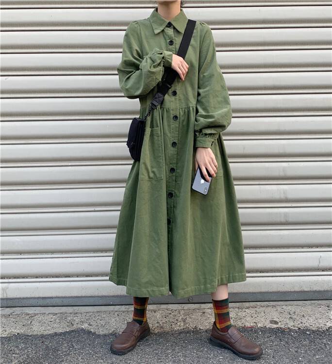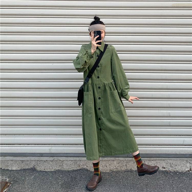 ロング ワンピース シャツ ワンピ レディース ミモレ丈 コーデュロイ 長袖 春 秋 冬 レトロ 大人かわいい カジュアル アウター 羽織 ポロ襟 ギャザー 10代 20代 緑 グリーン 青 30代