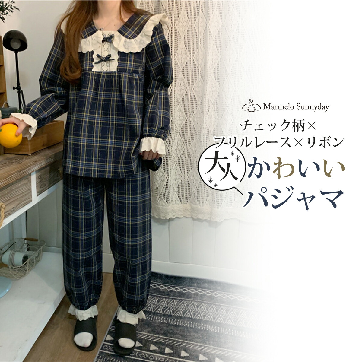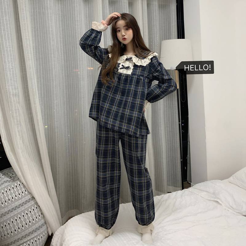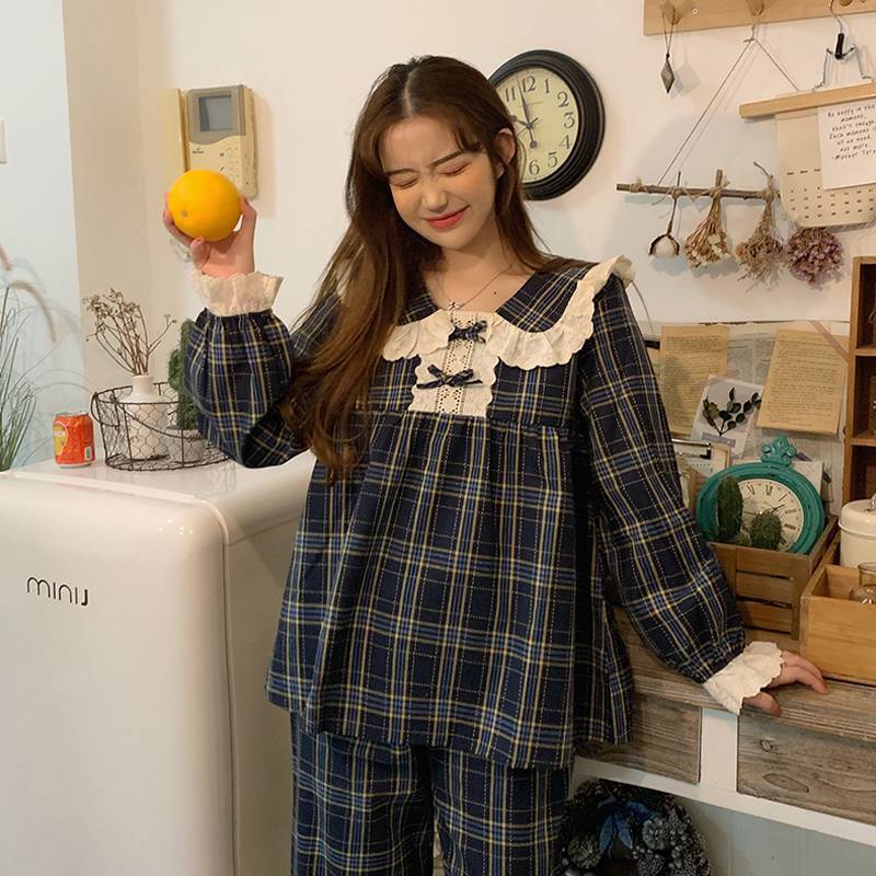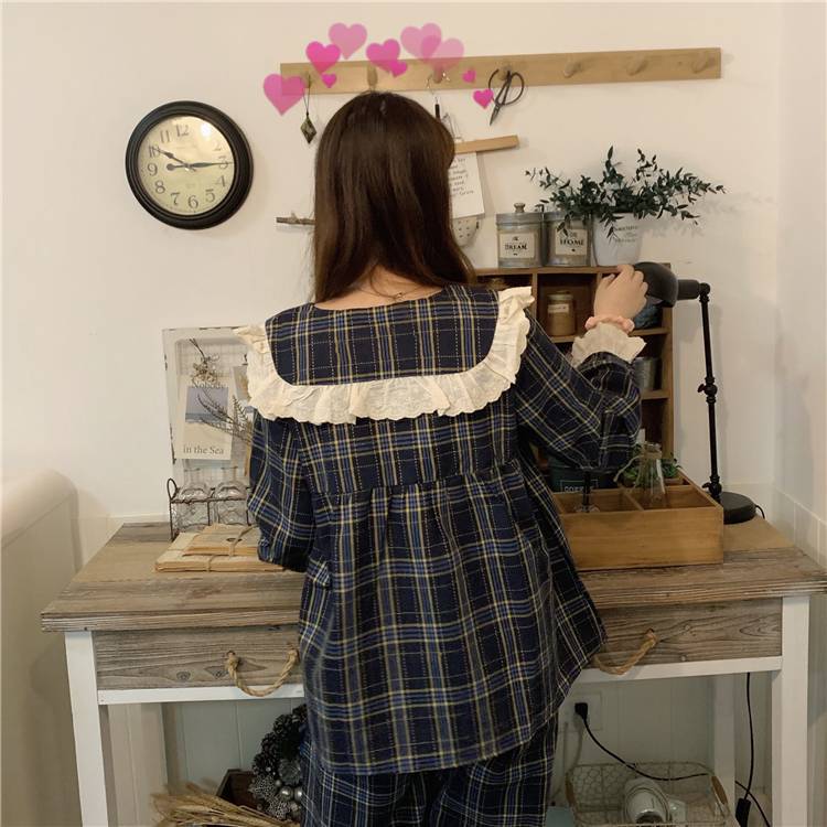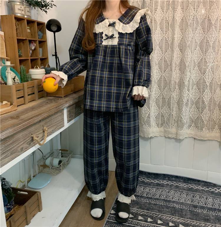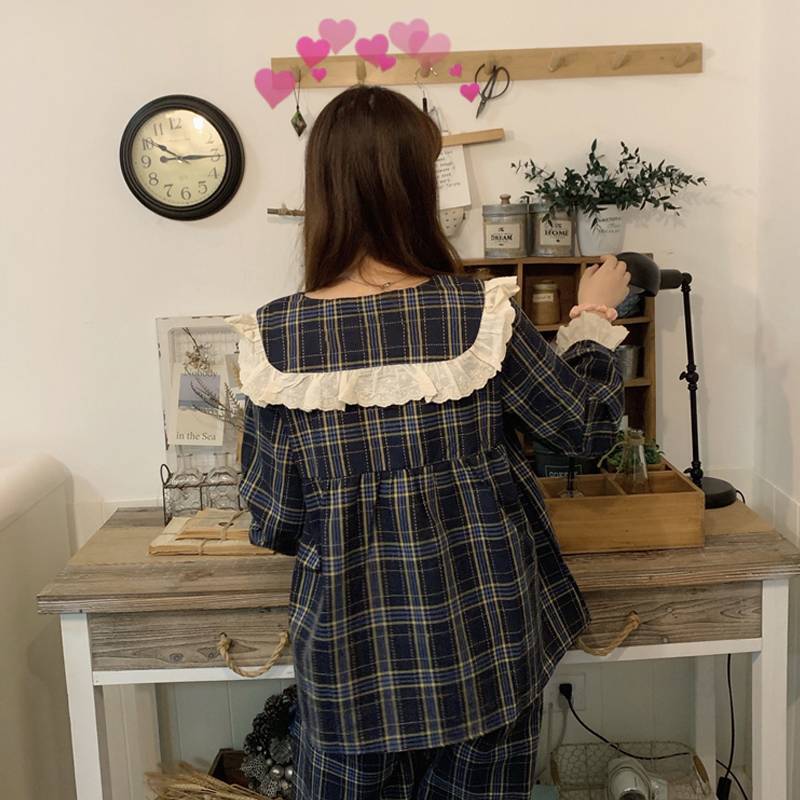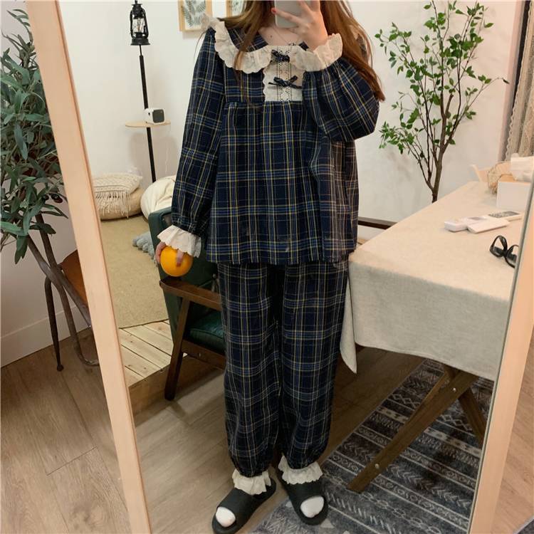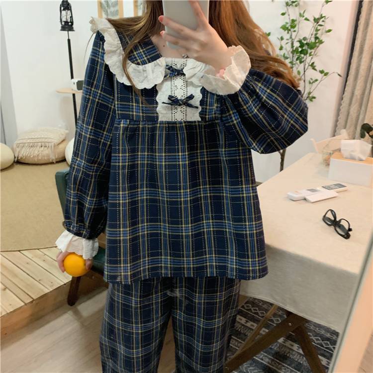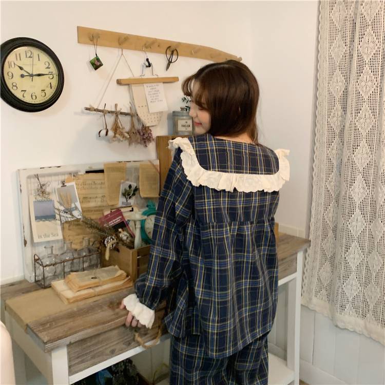 長袖 パジャマ レディース 上下セット チェック柄 かわいい ルームウェア 寝巻き 部屋着 ホームウェア パンツ 個性的 韓国 おしゃれ レース 春 秋 冬 フリル リボン ガーリー 青 ネイビー 綿