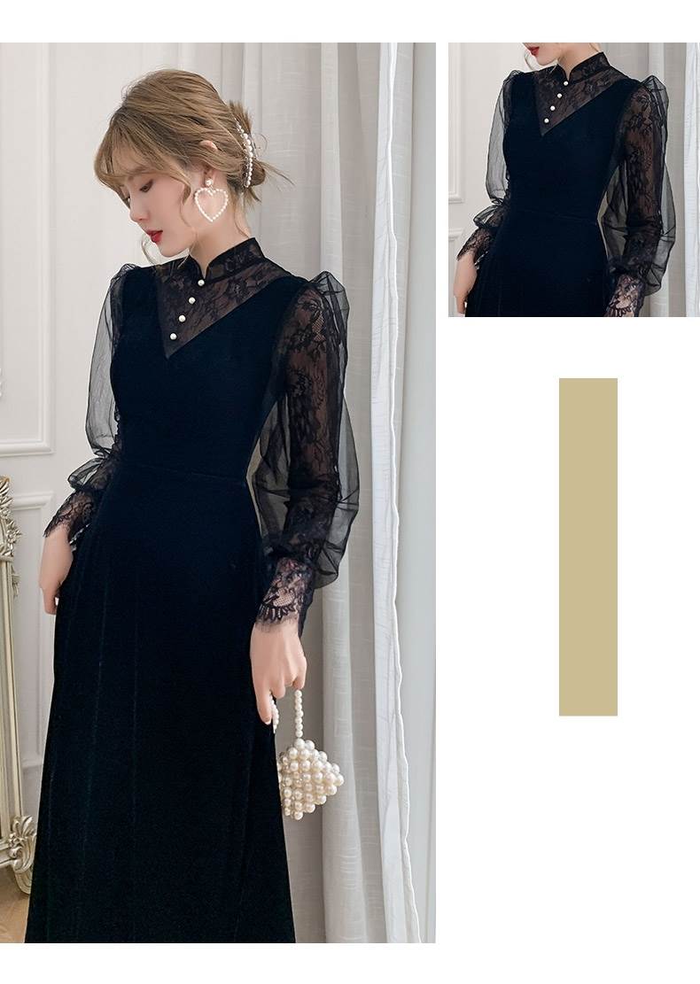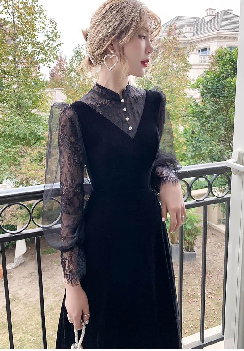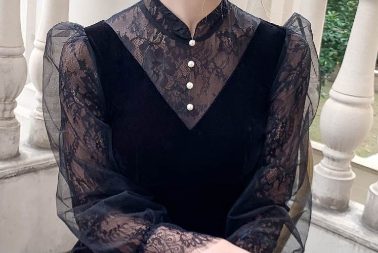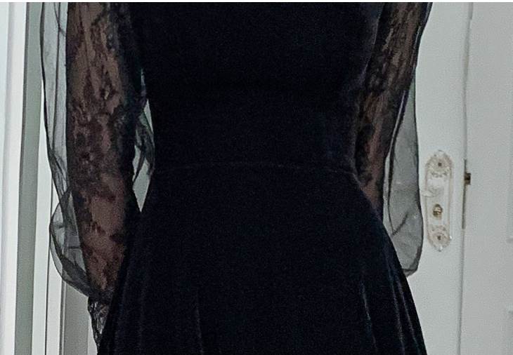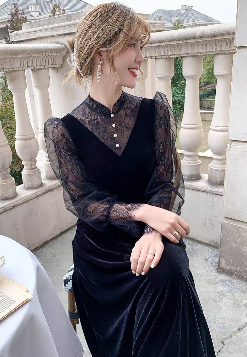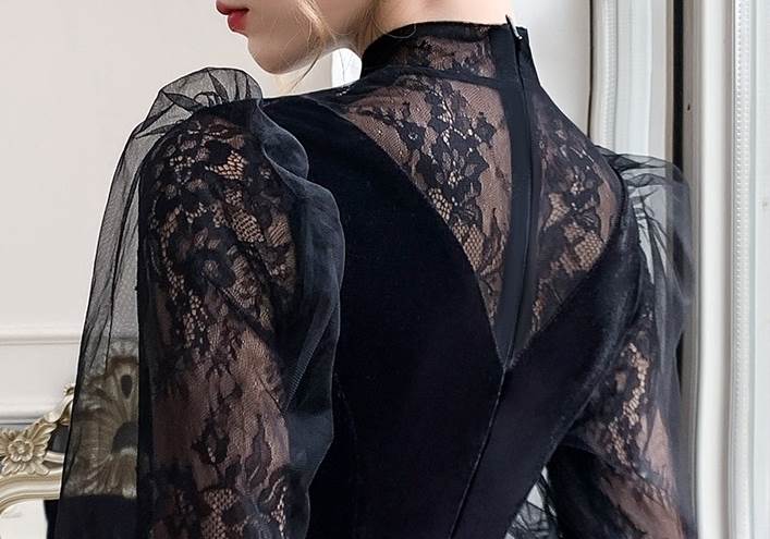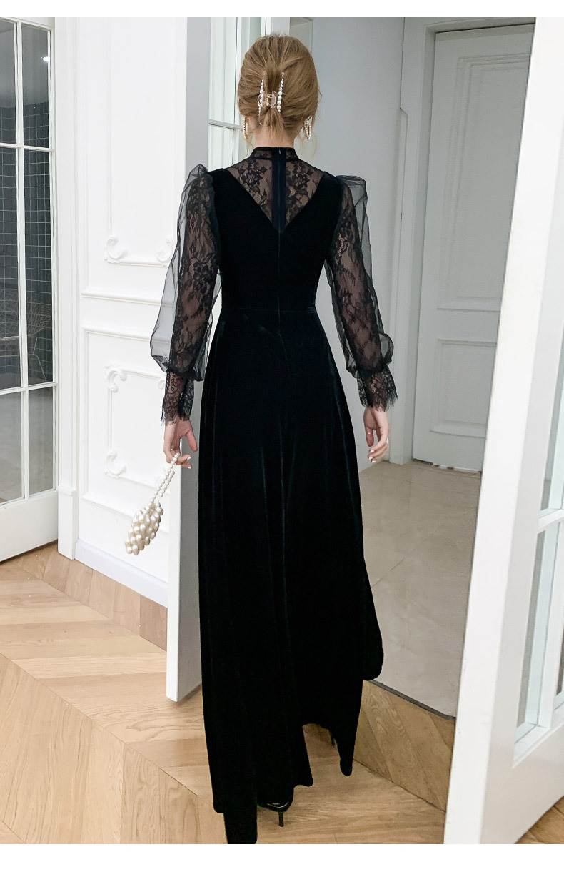 ベルベットとレースブラウスのコントラストが華やかなロングドレス