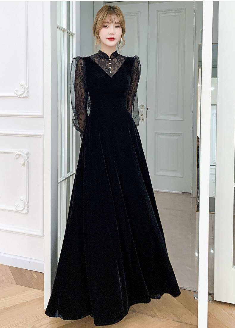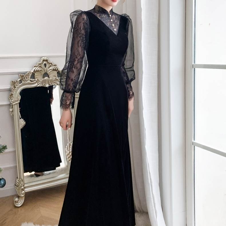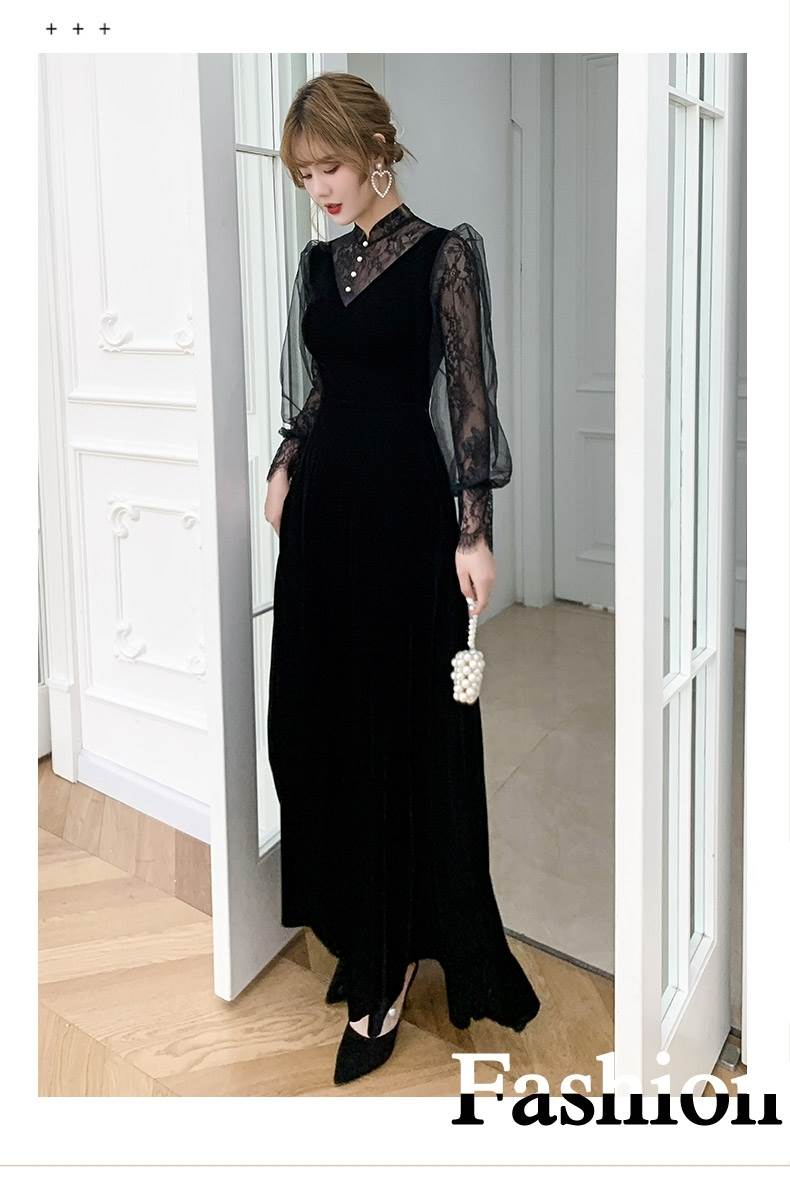 パーティードレス かっこいい 個性的 ロング 黒 長袖 総レース シフォン ブラウス風 大きいサイズ 結婚式 二次会 お呼ばれ ドレス 演奏会 ピアノ 発表会 可愛い スタンドカラー 袖 ロングドレス