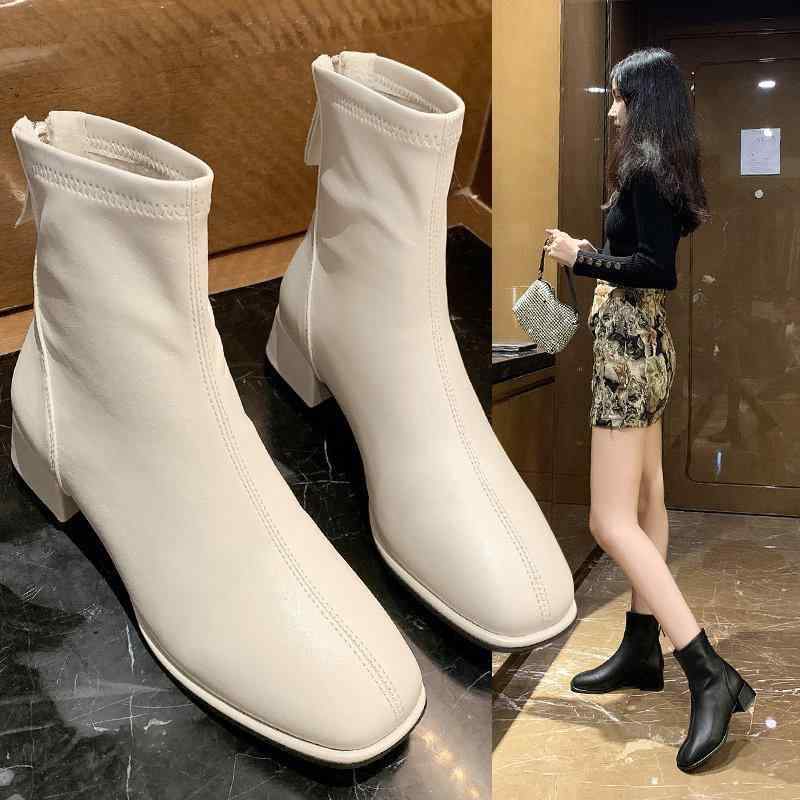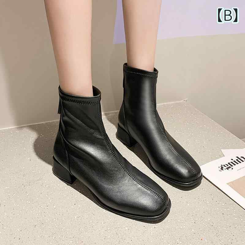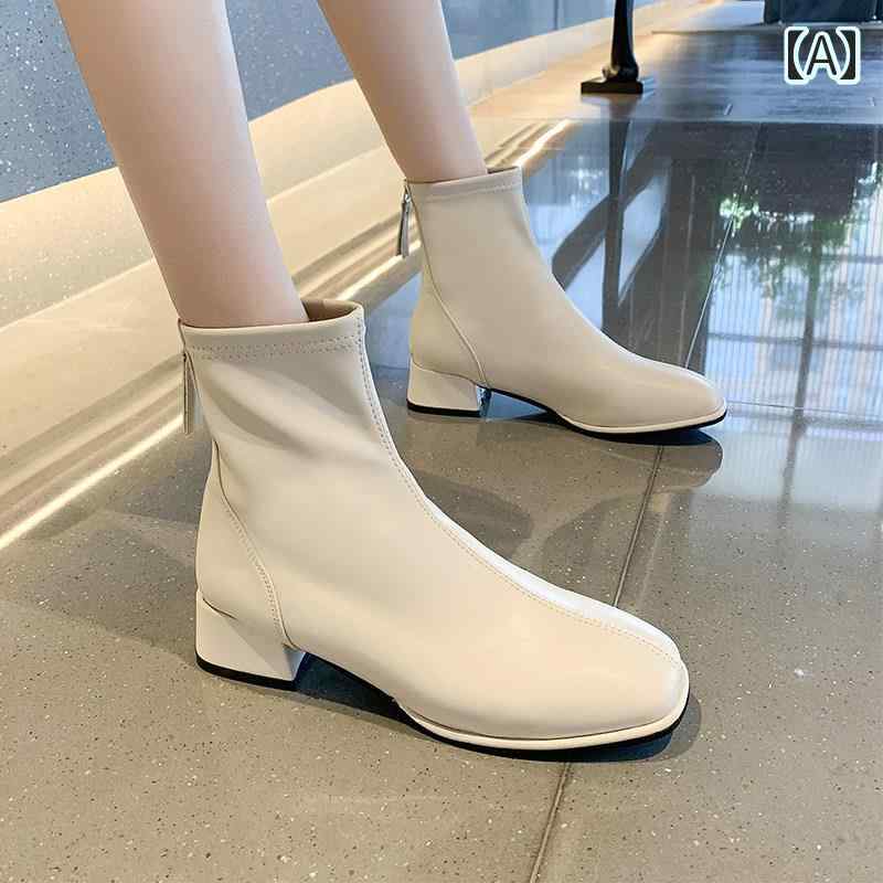 ショートブーツ 黒 白 柔らかい ソフトレザー 韓国系 ブーツ ミドル丈 ショート丈 チャンキーヒール オルチャン系 スクエアトゥ かっこいい きれいめ スキニー レディース ブラック ホワ ブーティ