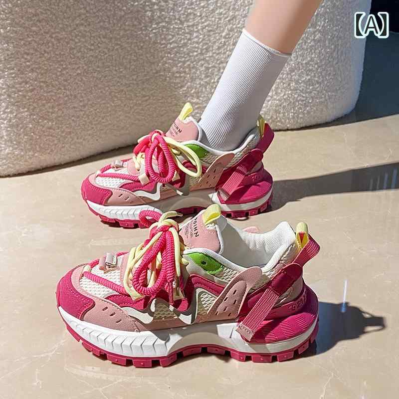 ダッドスニーカー カラフル 可愛い 厚底 スニーカー 韓国系 レディース ビビッドピンク 赤 緑 グリーン 紺色 ネイビー バイカラー 派手 華やか ポップ 女子 ごつ可愛い ハイテクスニ オルチャン
