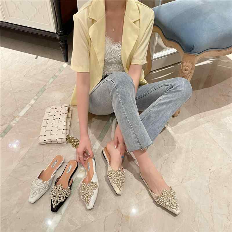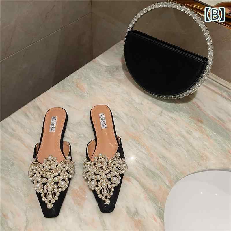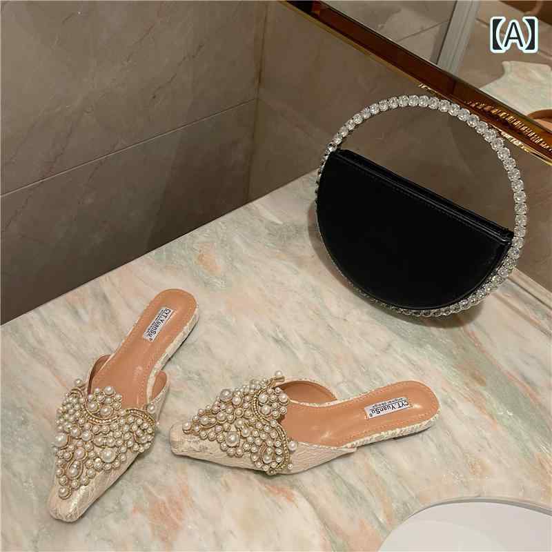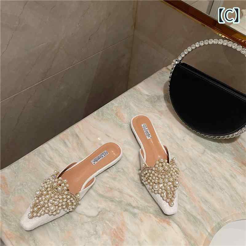 ミュール サンダル パール キラキラ 華やか つっかけ 大人カジュアル クラシカル ウェディング シューズ フラット ぺたんこ 黒 白 ベージュ スクエアトゥ セレブ エレガント 1cm ロー 高級感