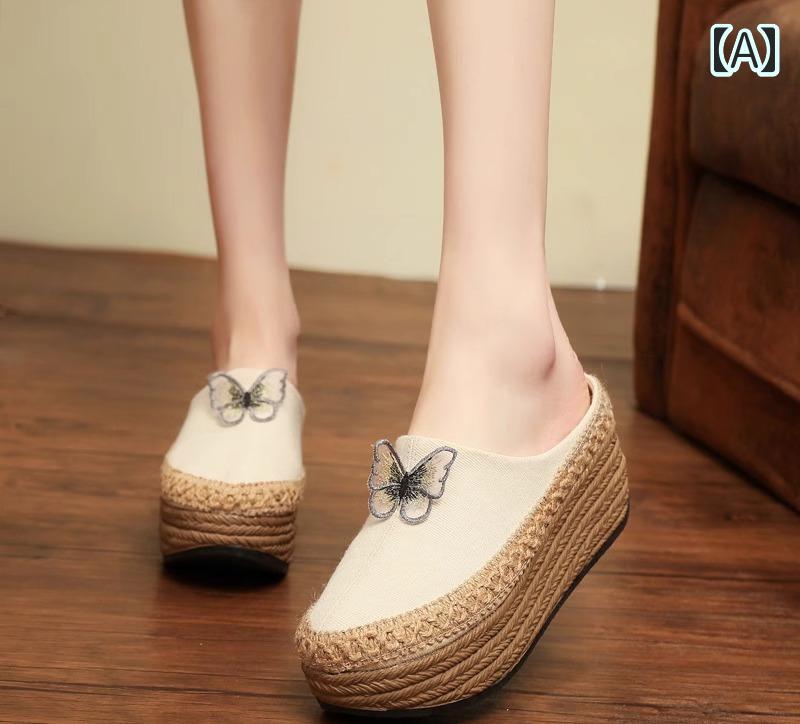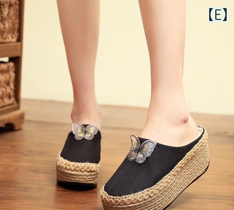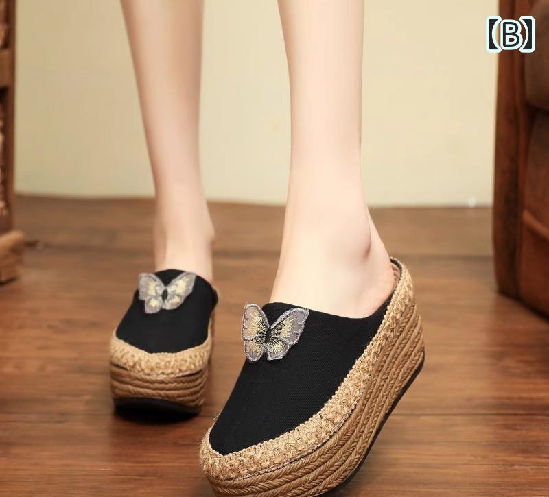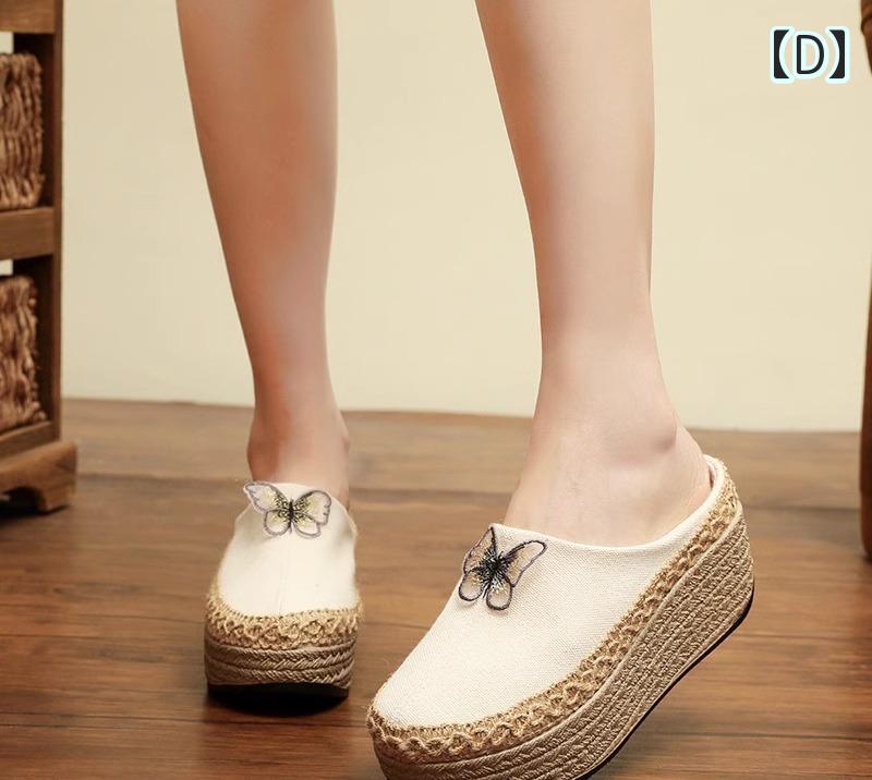 厚底 サボサンダル ミュール 蝶 ちょうちょ アジアン エスニック サンダル レトロ 刺繍 ウッディ 麦わら ストローソール レディース 春夏 シューズ 白 ホワイト ブラック ヒョウ柄 レオパー 黒
