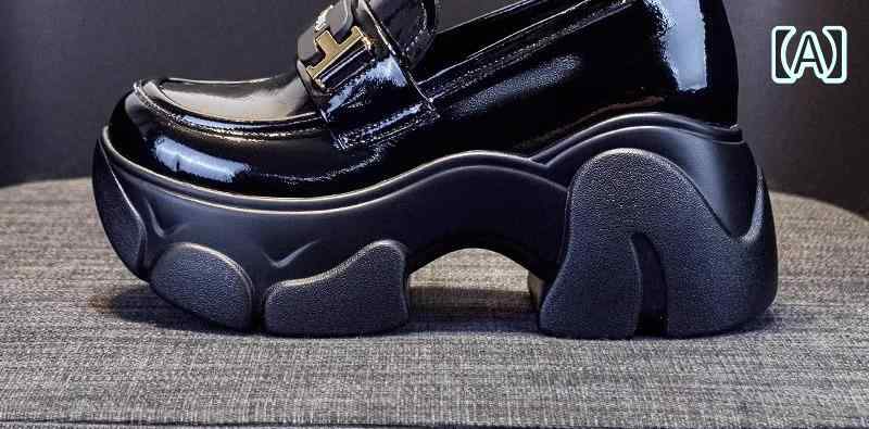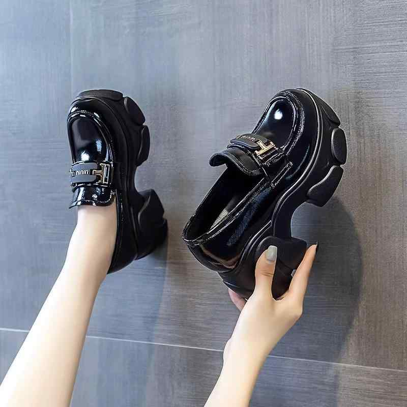 厚底 ローファー ゴツい 可愛い 8cm ウェッジソール スリッポン パンプス 黒 白 韓国系 大人可愛い かっこいい レザーシューズ 光沢 艶感 英文字 個性的 ハイヒール 身長アップ ロゴバックル
