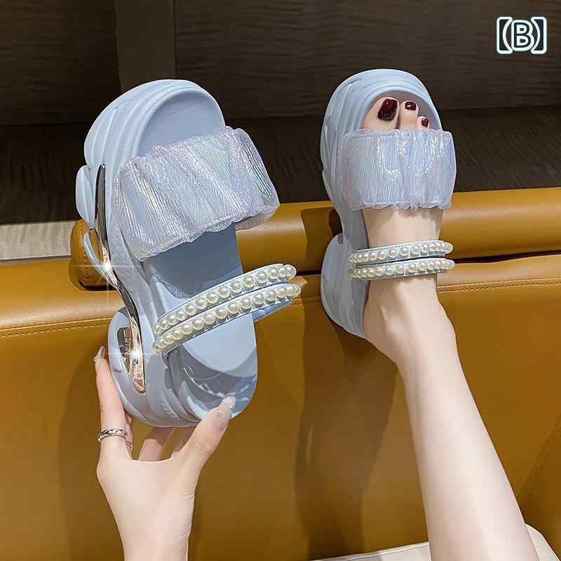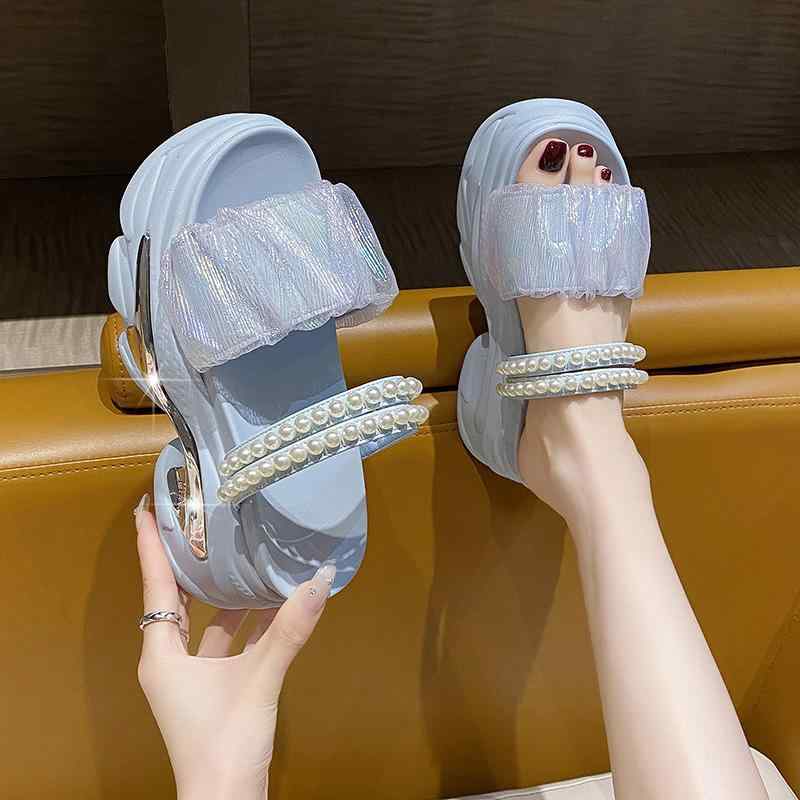 厚底 サンダル スリッパ パール メタルデザイン 個性的 韓国系 ビーサン スポサン 黒 白 ピンク 水色 くしゅくしゅ シアー 透け感 キラキラ 華やか 春夏 ごつ可愛い kawaii ビ シューズ