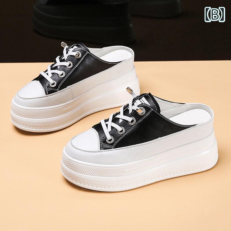 8cm 超厚底 スニーカー サンダル 黒 白 可愛い 韓国風 スリッパ レディース サボ 春夏 シューズ 紐あり レースアップ スポーティー かっこいい 個性的 バイカラー モノクロ 運動靴 フラット