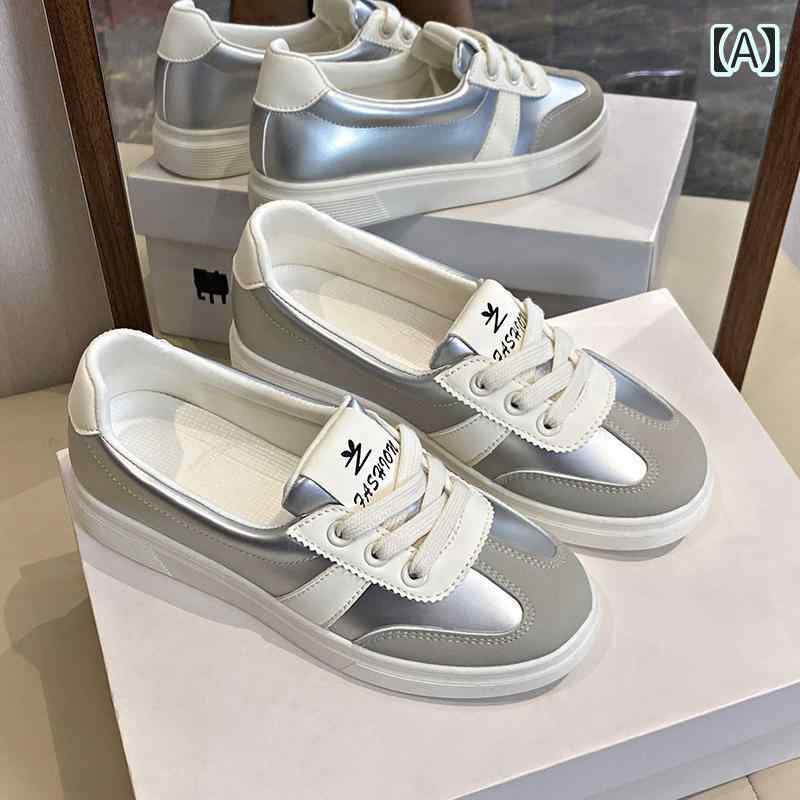 スニーカー 浅口 レトロ 可愛い 韓国系 スポーツ シューズ バイカラー メタリック シルバー 銀色 黒 赤 白 カラフル 切り替えデザイン 個性的 合皮 レザースニーカー リラック バレエシューズ風