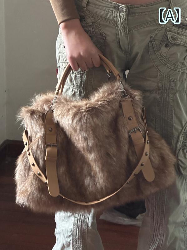 トートバッグ もこもこ ファー ハンドバッグ かっこいい 大容量 2way レディース 毛皮風 ロック スタッズ 個性的 肩掛け 手提げ バック 異素材MIX レザー 収納力 高級感 インス 柔らかい