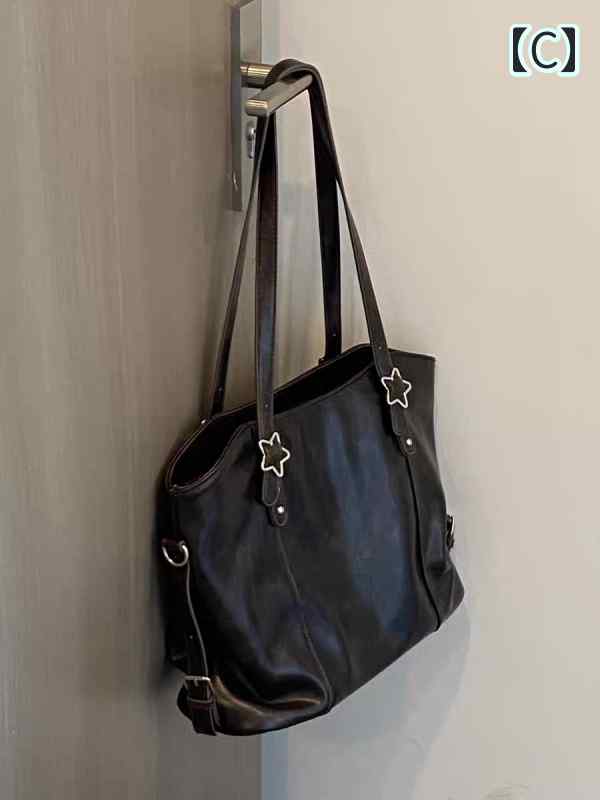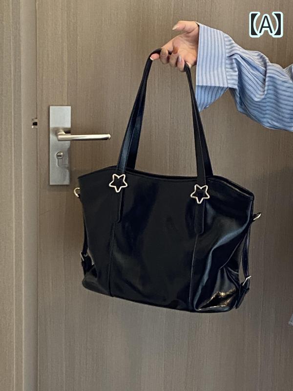 トートバッグ 星型 スター飾り 大人可愛い レトロ 黒 トート レザーバッグ スクエア型 大容量 A4 通勤 OL ビジネスバッグ 使いやすい ベーシック 個性的 革バッグ 柔らかい 通学 ブラック