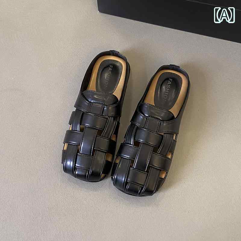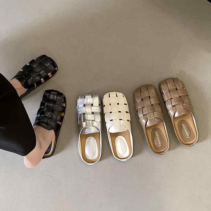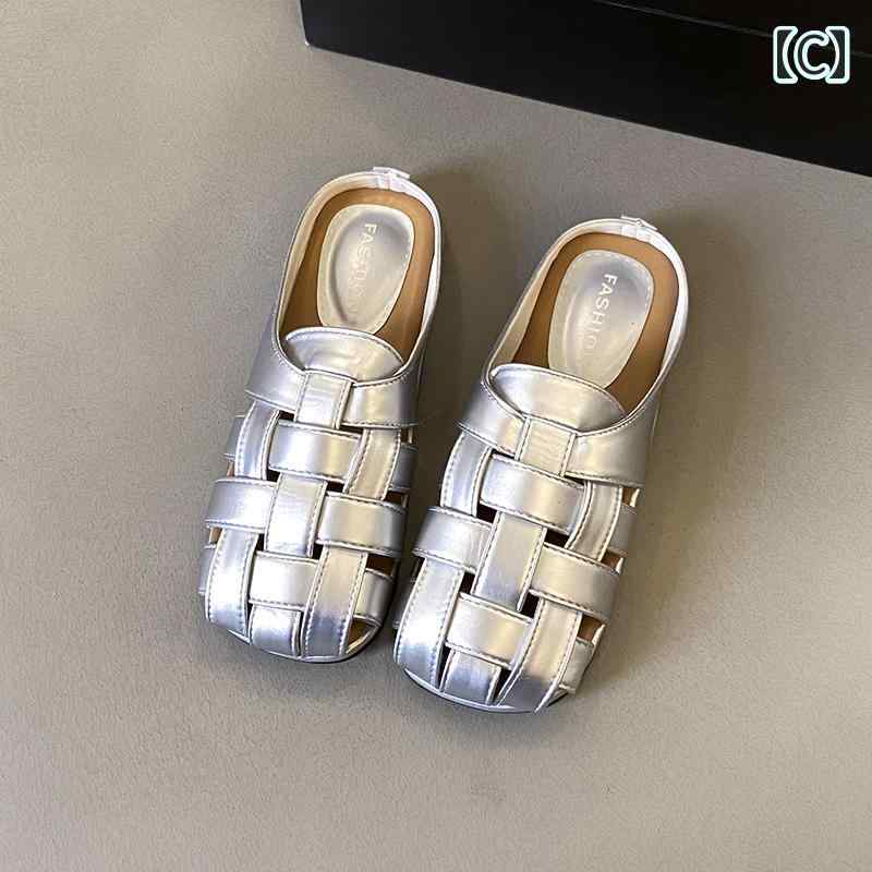 コンフォートサンダル 編み込み おしゃれ スリッパ サンダル スクエアトゥ クロス 網網 きれいめ かっこいい 春夏 つっかけ ペタンコ シューズ 黒 茶色 白 シルバー リラックス 買い メタリック
