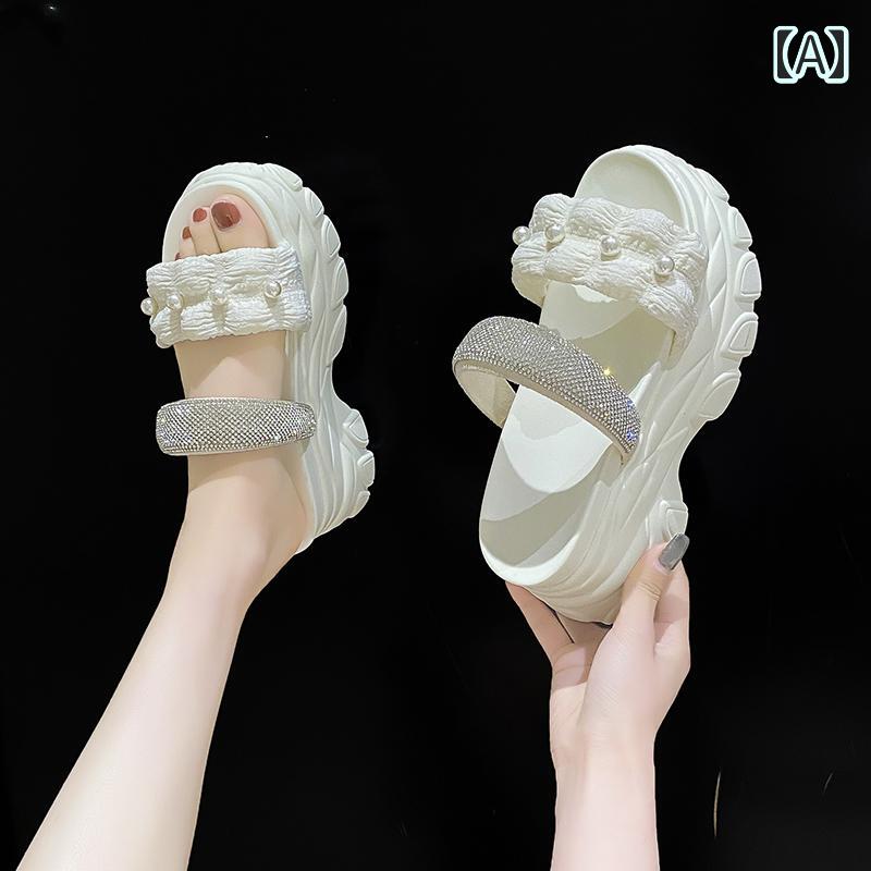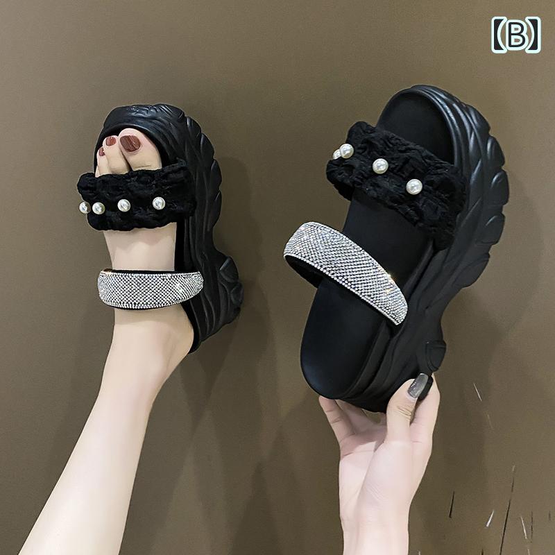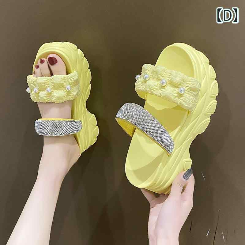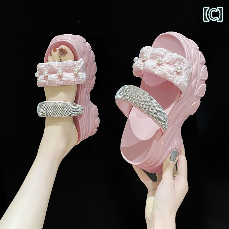 ビーチサンダル 可愛い ラインストーン パール付 個性的 厚底 サンダル 韓国女子 春夏 シューズ 黒 白 黄色 ピンク ビーサン くしゅくしゅ 華やか アウトドア レジャー タウンユース 映える 海