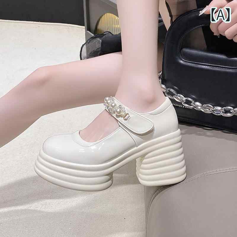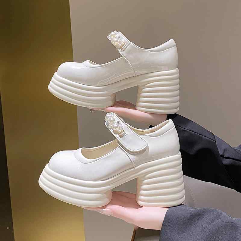 8cm ウェディングシューズ ラインストーン パール 可愛い ローファー パンプス 白 光沢 エナメル 韓国系 個性的 結婚式 二次会 花嫁 白シューズ 身長アップ チャンキーヒール ロリ ハイヒール