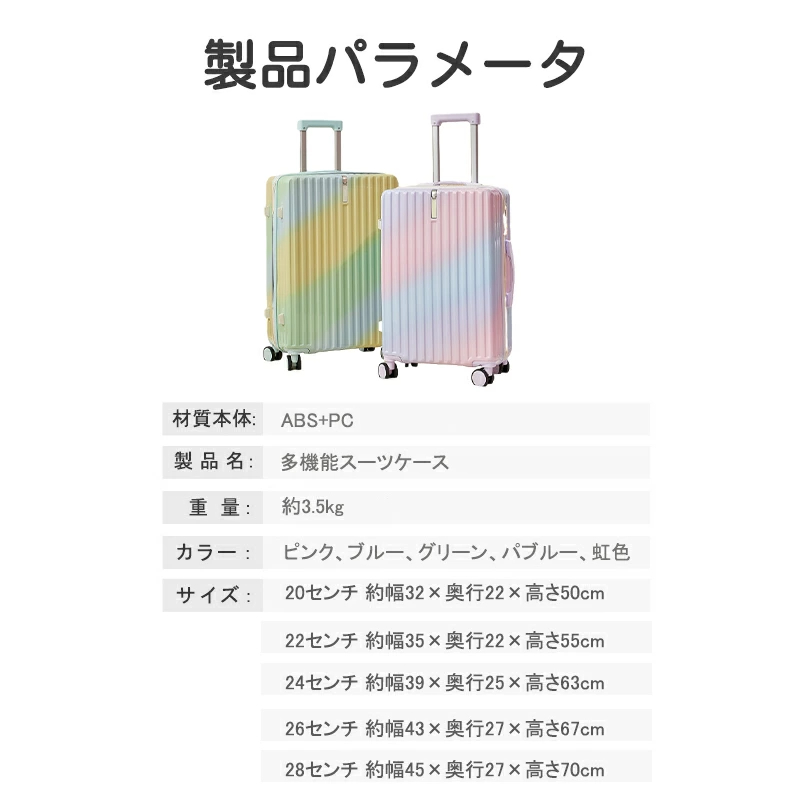 スーツケース グラデーション キャリーケース 5カラー 小型 中型 大型 ファスナー ダブルキャスター サスペンション 耐衝撃 暗証番号コード パーテーション 旅行 おしゃれ かわいい■サイズ