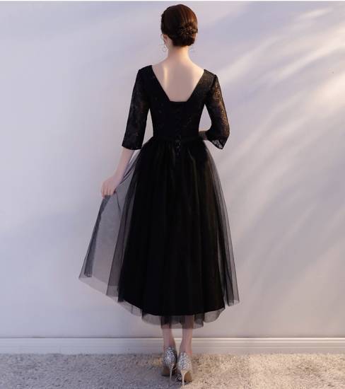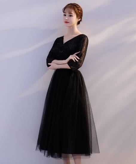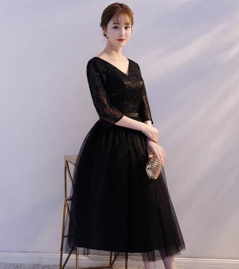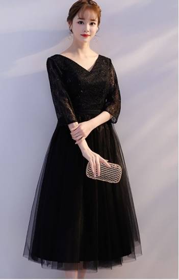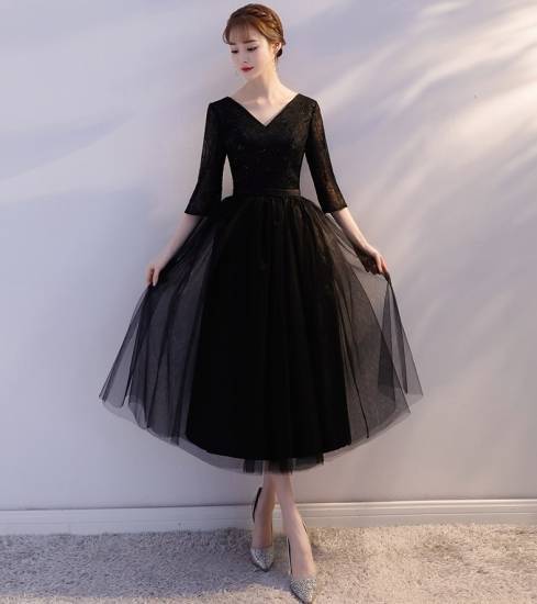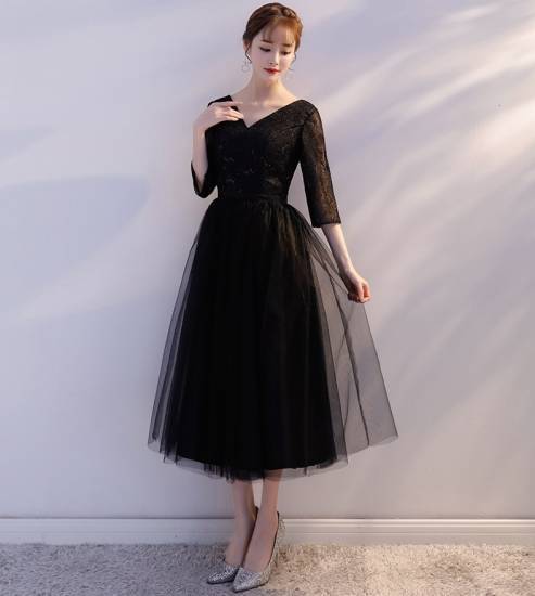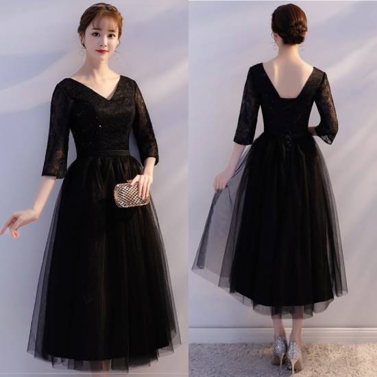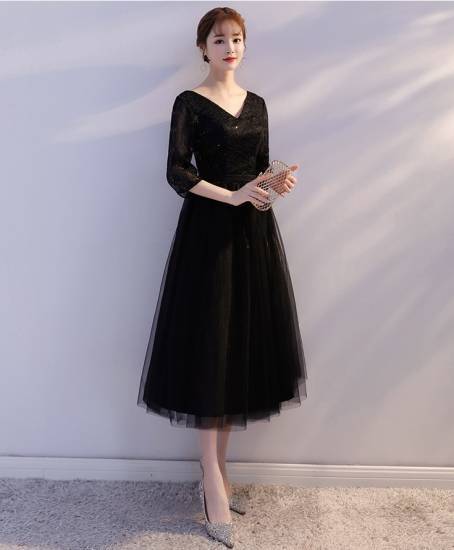 ドレス 食事会 フォーマル ゲスト 七分袖 Vネック ミモレ丈 フレア チュール 10代 20代 30代 大きいサイズ 新作 春 秋 冬 ブラックドレス 夏