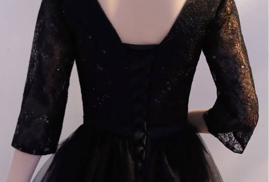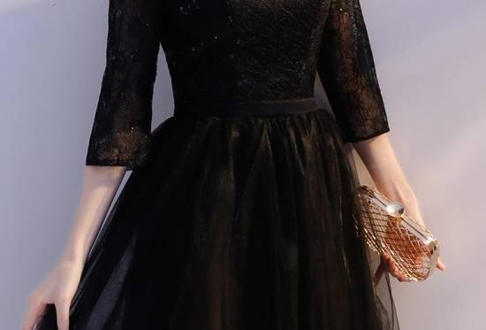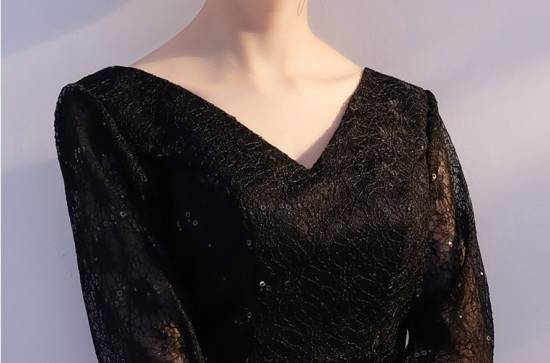 広めのVネックで胸元をスッキリと見せ、ボリューミーなチュールスカートをドッキングしたかのようなブラックドレスです。
