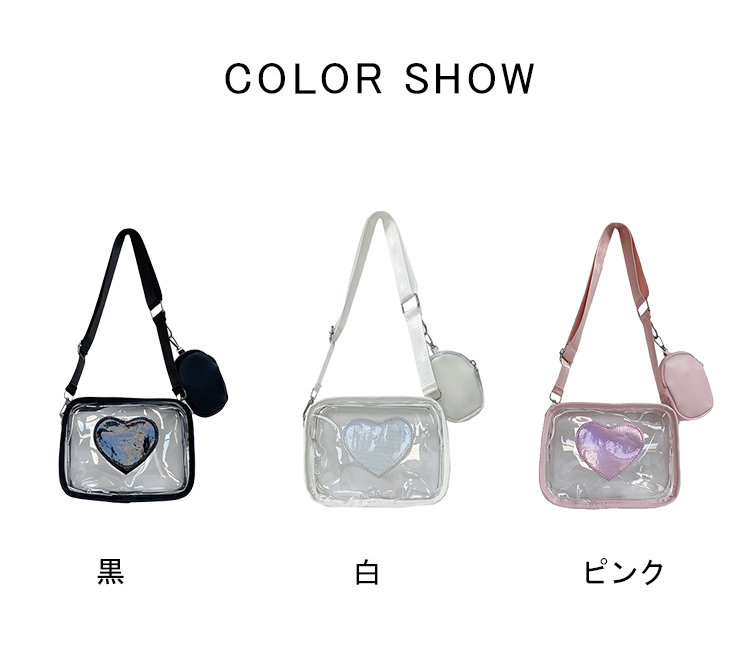 前の透明カバーに飾り板が入っていて、自分の好きな小物を入れることができるバッグです。 好きな芸能人や、アニメの写真 、缶バッジ、ストラップ、ぬいぐるみ、キーホルダーなどを入れるだけで、世界一つだけ自分のバッグです、毎日楽しく使える。