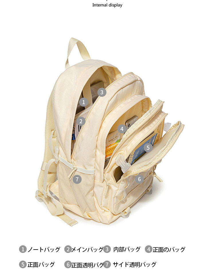 外側:サイドバッグ*2、透明バッグ*1、ファスナーバッグ*1、背面バッグ*1