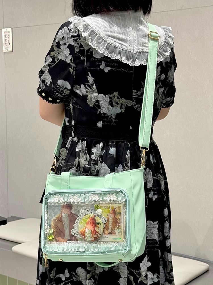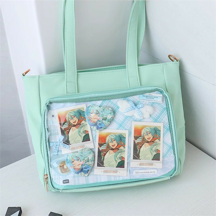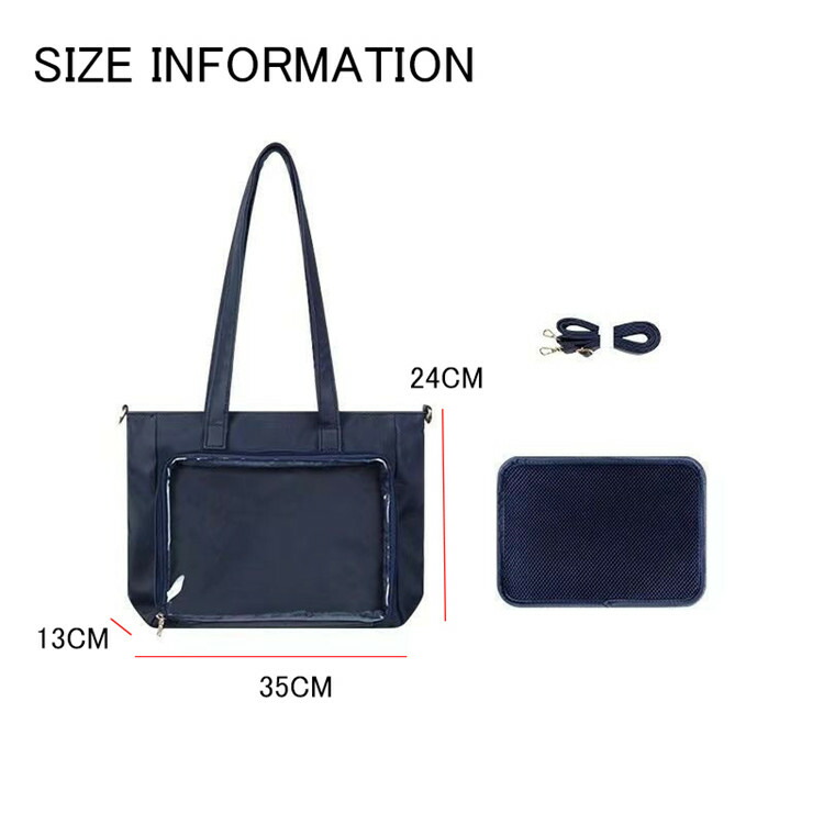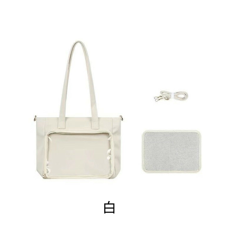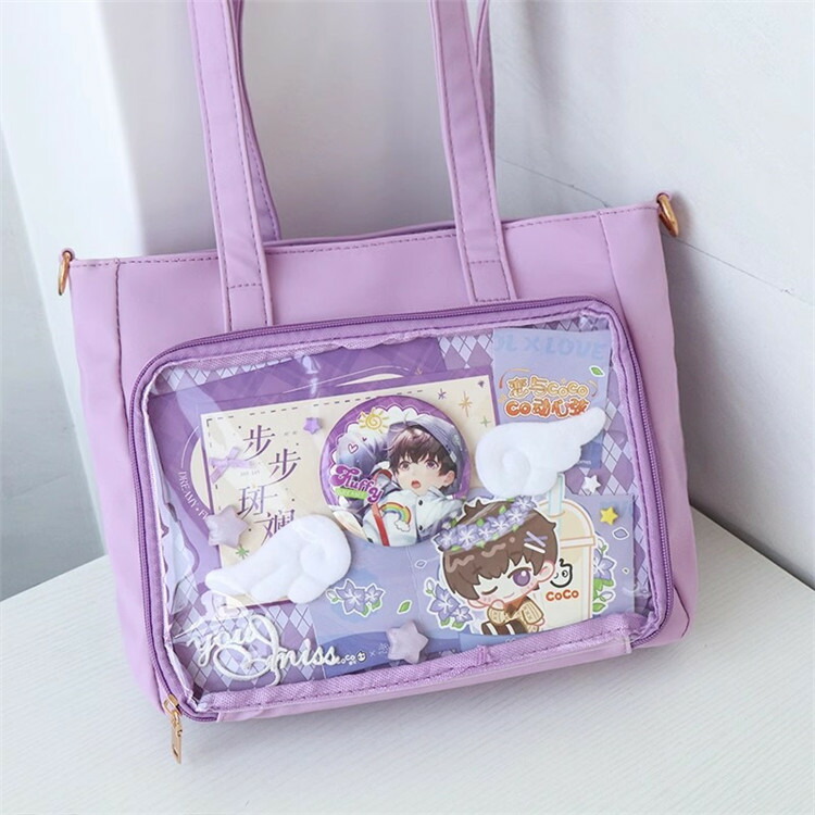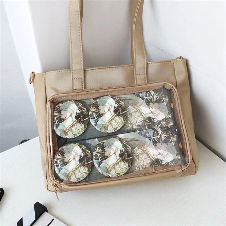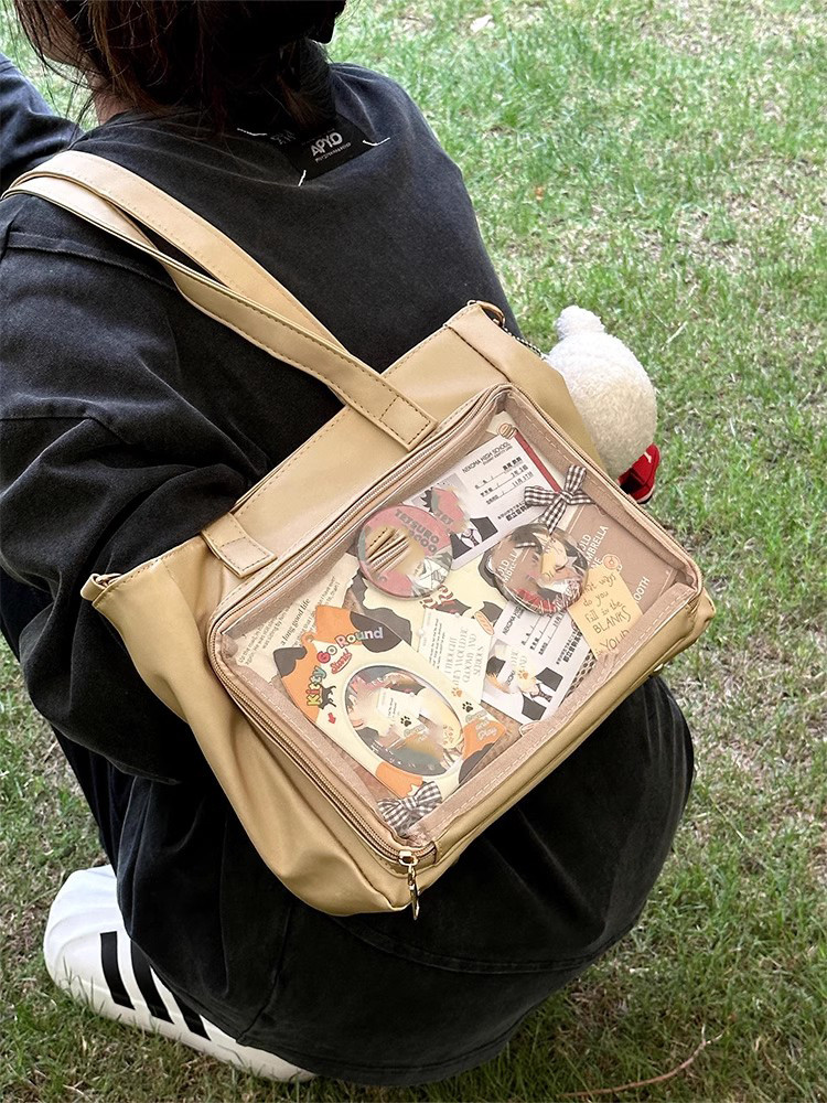 前の透明カバーに飾り板が入っていて、自分の好きな小物を入れることができるバッグです。 好きな芸能人や、アニメの写真 、缶バッジなどを入れるだけで、簡単に世界で1つたったのオリジナルバッグの完成です、毎日楽しく使える。