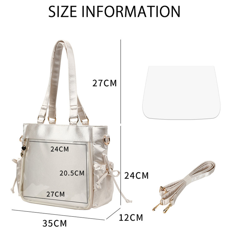前の透明カバーに飾り板が入っていて、自分の好きな小物を入れることができるバッグです。 好きな芸能人や、アニメの写真 、缶バッジ、ストラップ、キーホルダーなどを入れるだけで、簡単に世界で1つたったのオリジナルバッグの完成です、毎日楽しく使える。
