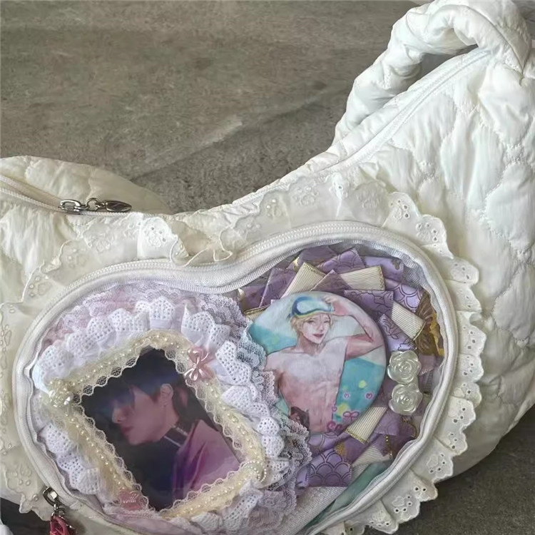 前の透明カバーに飾り板が入っていて、自分の好きな小物を入れることができるバッグです。 好きな芸能人や、アニメの写真 、缶バッジ、ストラップ、キーホルダーなどを入れるだけで、簡単に世界で1つたったのオリジナルバッグの完成です、毎日楽しく使える。