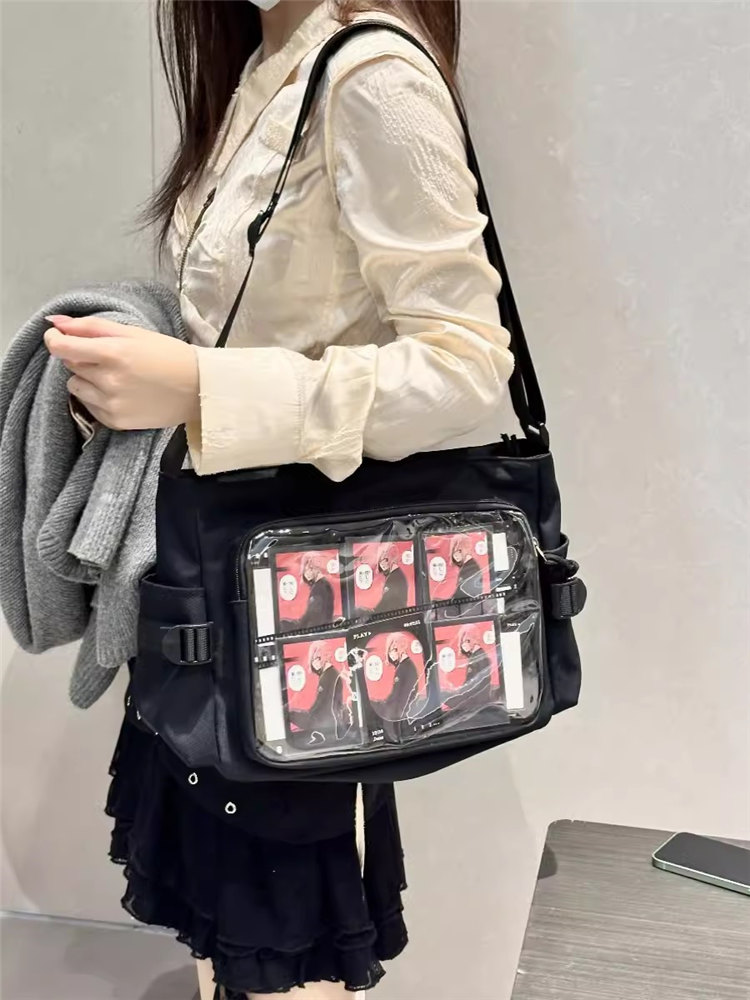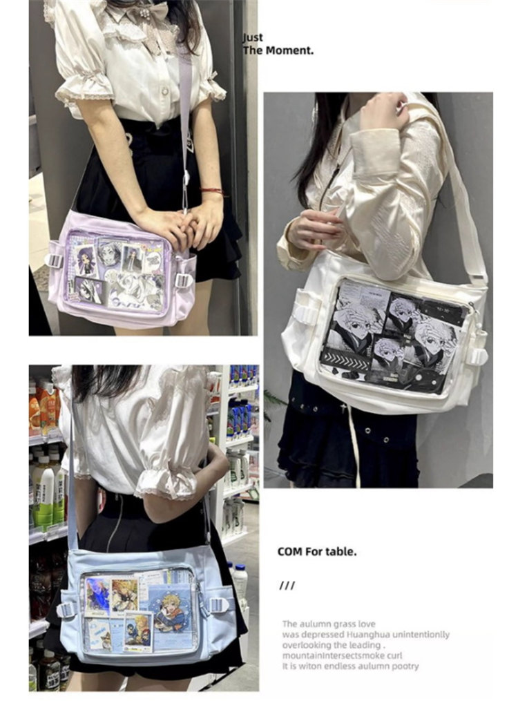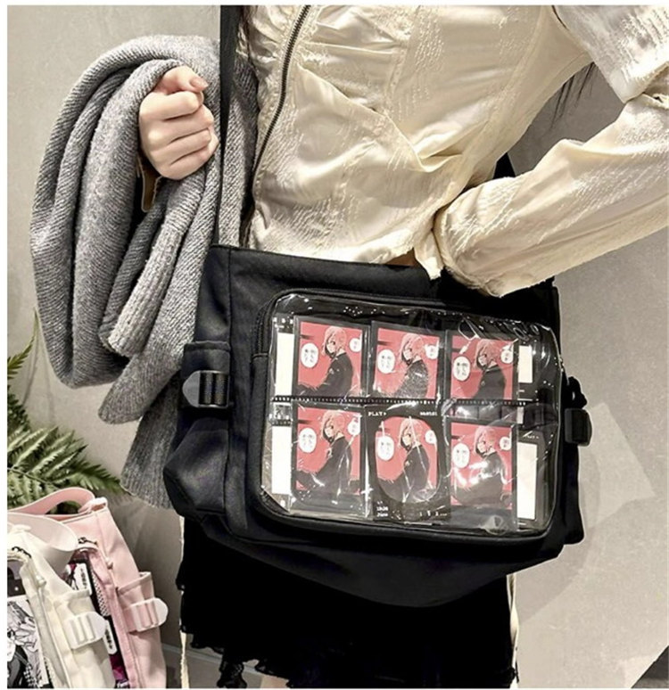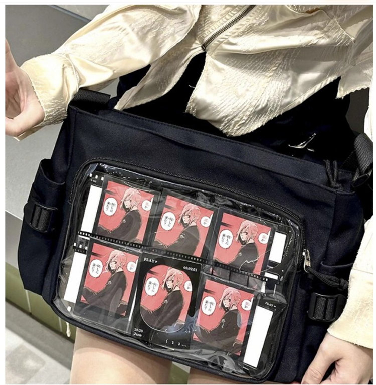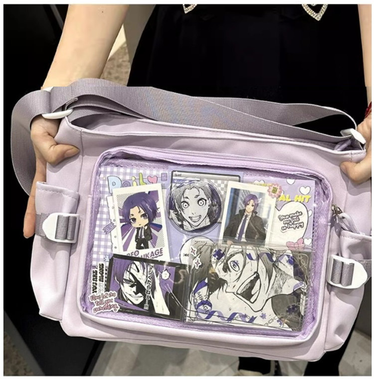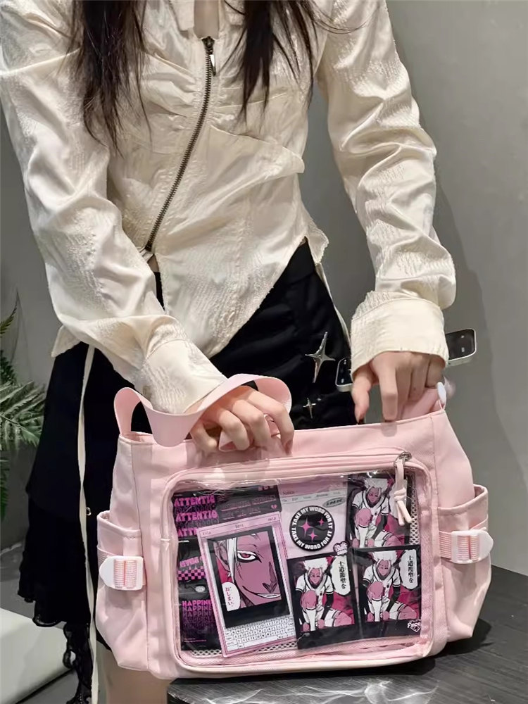 前の透明カバーに飾り板が入っていて、自分の好きな小物を入れることができるバッグです。 好きな芸能人や、アニメの写真 、缶バッジなどを入れるだけで、簡単に世界で1つたったのオリジナルバッグの完成です、毎日楽しく使える。