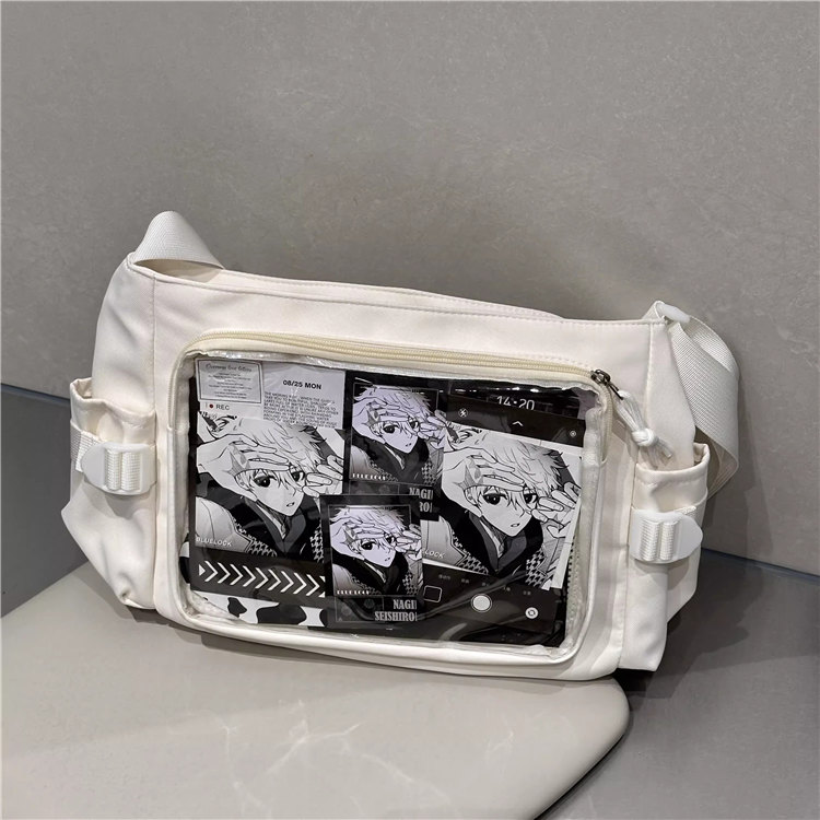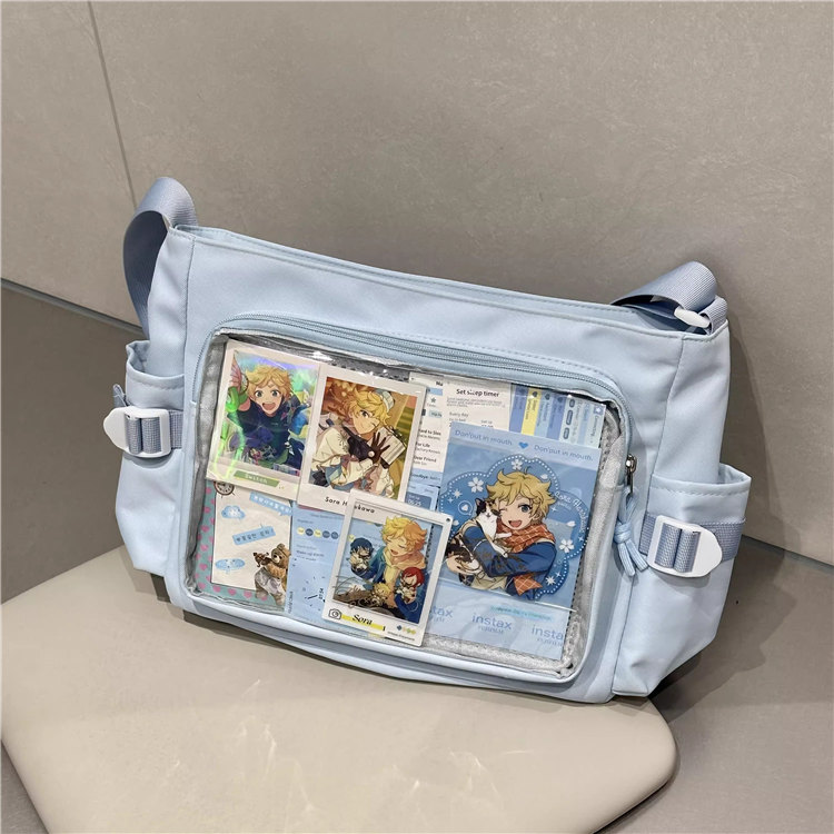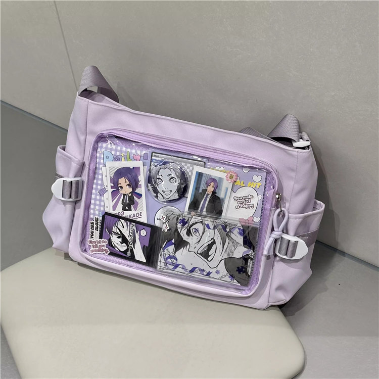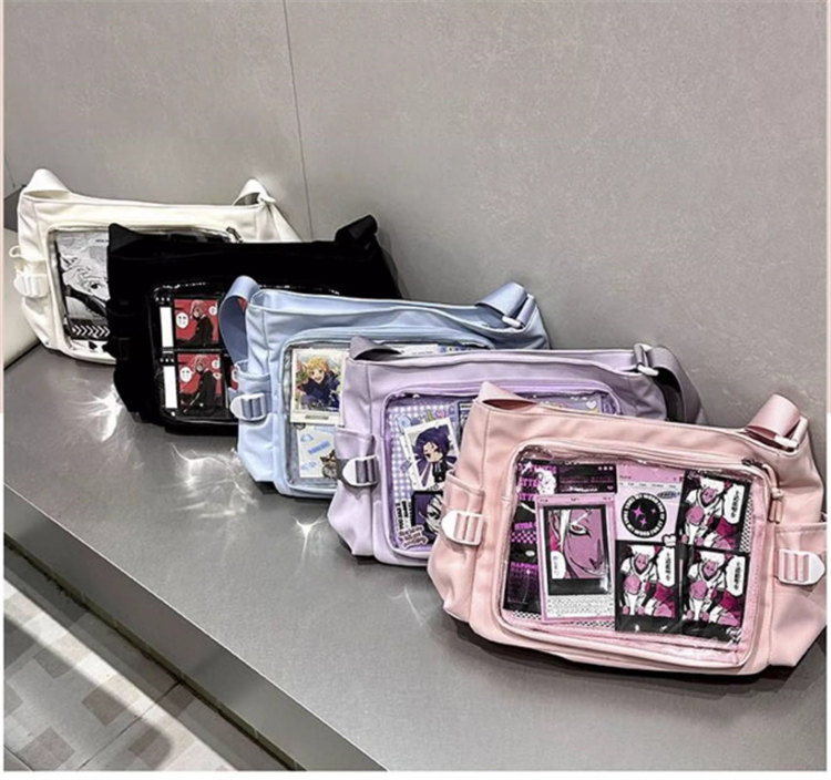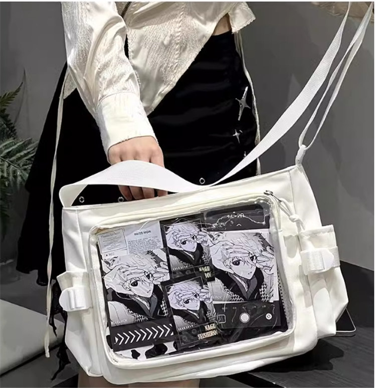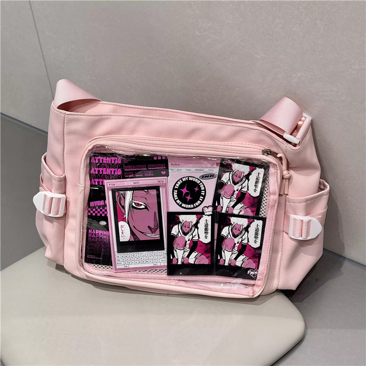 前の透明カバーに飾り板が入っていて、自分の好きな小物を入れることができるバッグです。 好きな芸能人や、アニメの写真 、缶バッジなどを入れるだけで、簡単に世界で1つたったのオリジナルバッグの完成です、毎日楽しく使える。