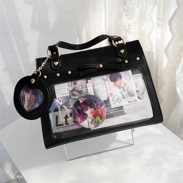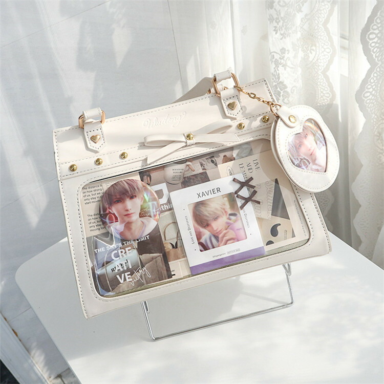 前の透明カバーに飾り板が入っていて、自分の好きな小物を入れることができるバッグです。 好きな芸能人や、アニメの写真 、缶バッジ、ストラップ、キーホルダーなどを入れるだけで、簡単に世界で1つたったのオリジナルバッグの完成です、毎日楽しく使える。