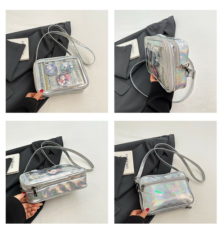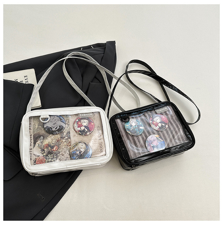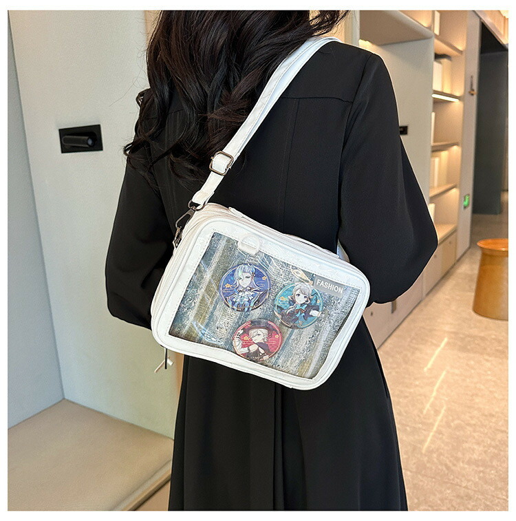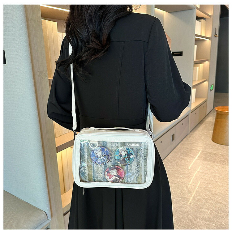 前の透明カバーに飾り板が入っていて、自分の好きな小物を入れることができるバッグです。 好きな芸能人や、アニメの写真 、缶バッジ、ストラップ、ぬいぐるみ、キーホルダーなどを入れるだけで、世界一つだけ自分のバッグです、毎日楽しく使える。
