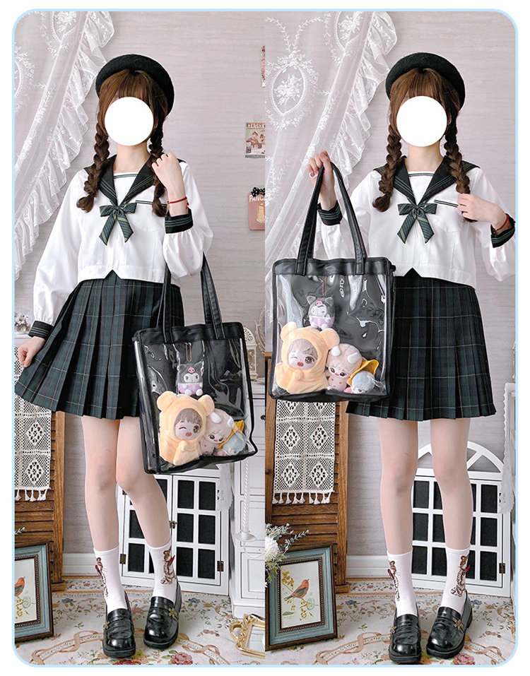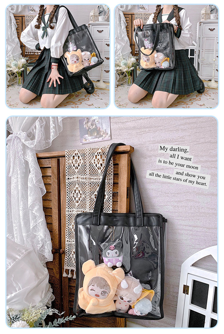 前の透明カバーに飾り板が入っていて、自分の好きな小物を入れることができるバッグです。 好きな芸能人や、アニメの写真 、缶バッジ、ストラップ、ぬいぐるみ、キーホルダーなどを入れるだけで、世界一つだけ自分のバッグです、毎日楽しく使える。