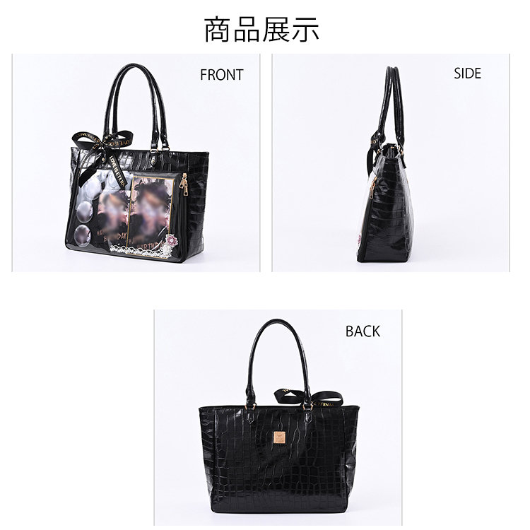 【デコ】 前の透明カバーに飾り板が入っていて、自分の好きな小物を入れることができるトートバッグです。