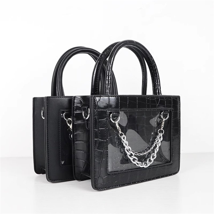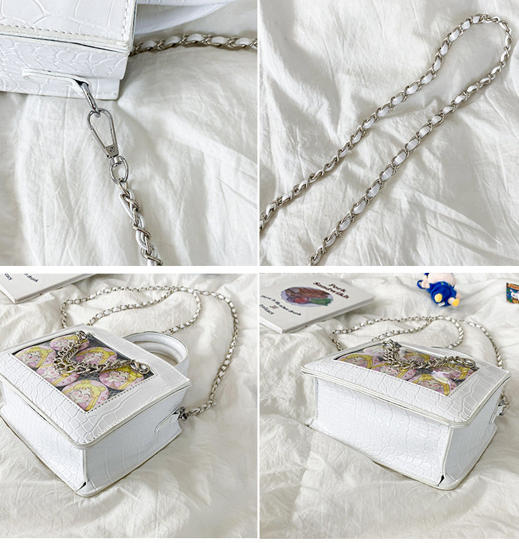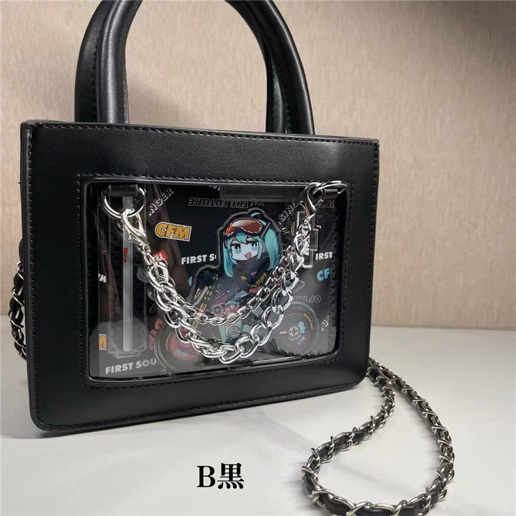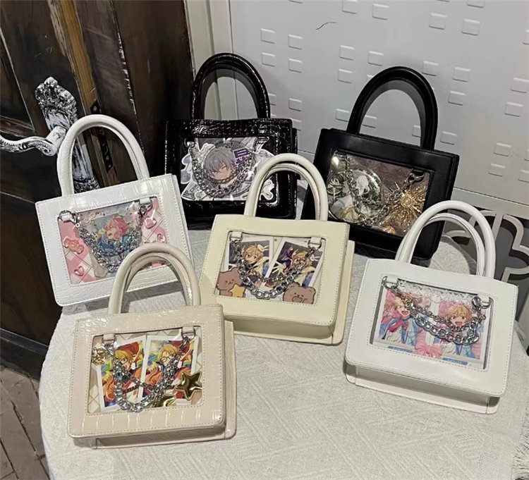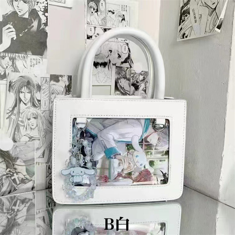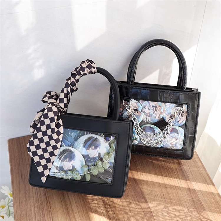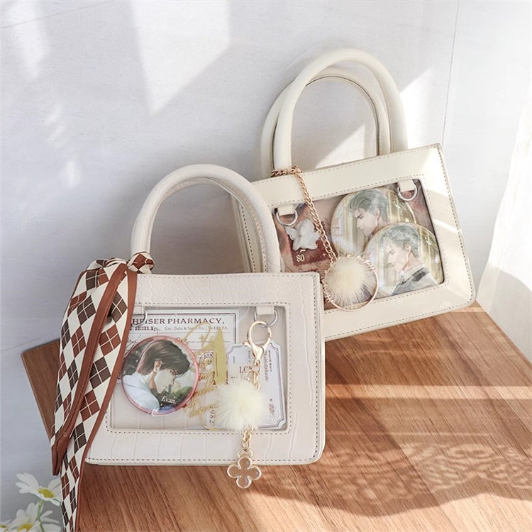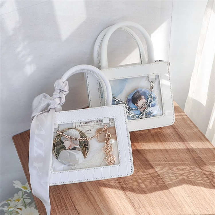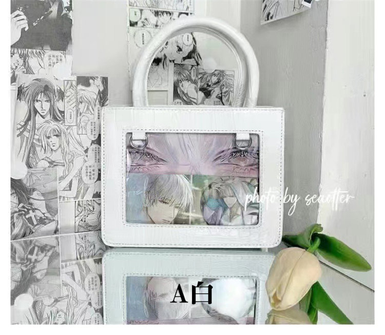 前の透明カバーに飾り板が入っていて、自分の好きな小物を入れることができるバッグです。 好きな芸能人や、アニメの写真 、缶バッジ、ストラップ、キーホルダーなどを入れるだけで、簡単に世界で1つたったのオリジナルバッグの完成です、毎日楽しく使える。