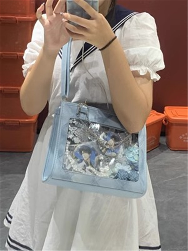前の透明カバーに飾り板が入っていて、自分の好きな小物を入れることができるバッグです。 好きな芸能人や、アニメの写真 、缶バッジ、ストラップ、キーホルダーなどを入れるだけで、簡単に世界で1つたったのオリジナルバッグの完成です、毎日楽しく使える。